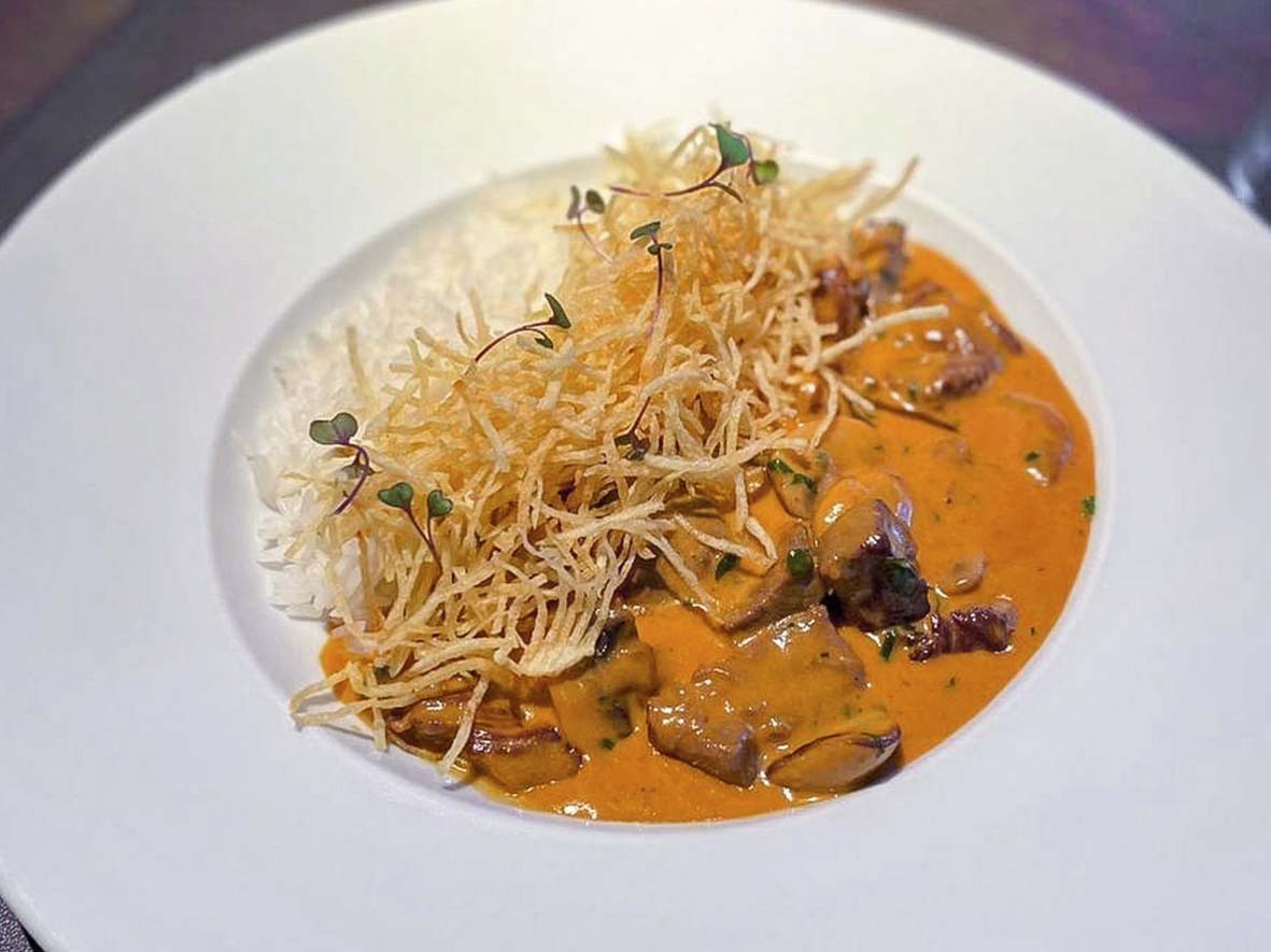 – Strogonoff de mignon com arroz branco e batata palha da casa.