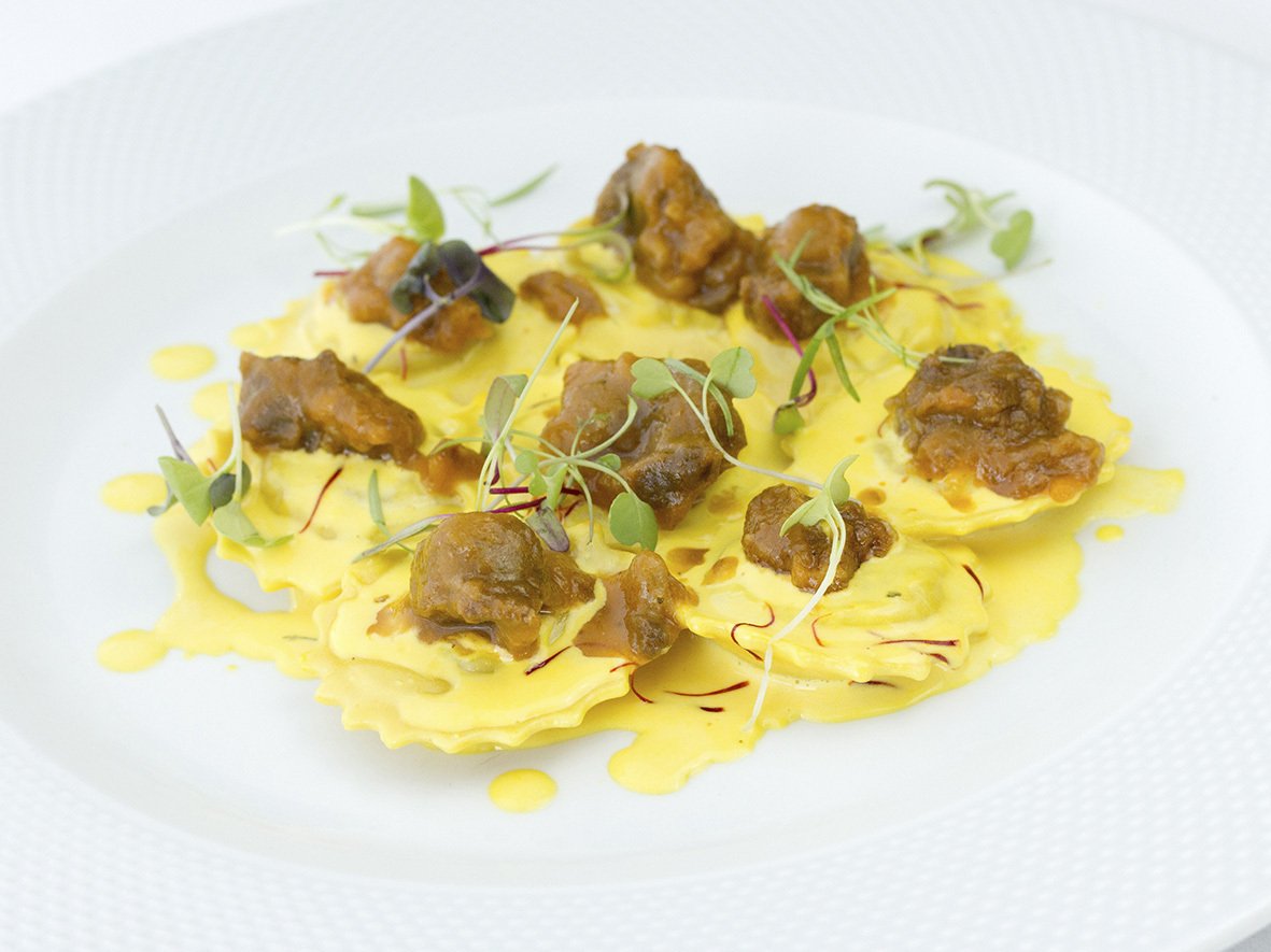 – Ravioli di Grana Padano, ragú di ossobuco e crema di zafferano: ravioli de Grana Padano, ragú de ossobuco e creme de açafrão.