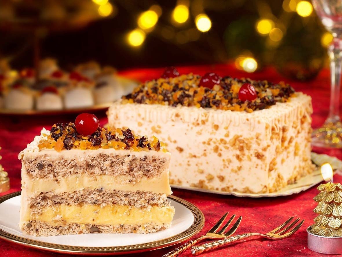 O Natale também tem massa de nozes, é recheado com trufas brancas, mix de frutas secas e baba de moça com crocante de nozes, e é coberto com mousse branco, frutas secas, nozes crocantes e cerejas.