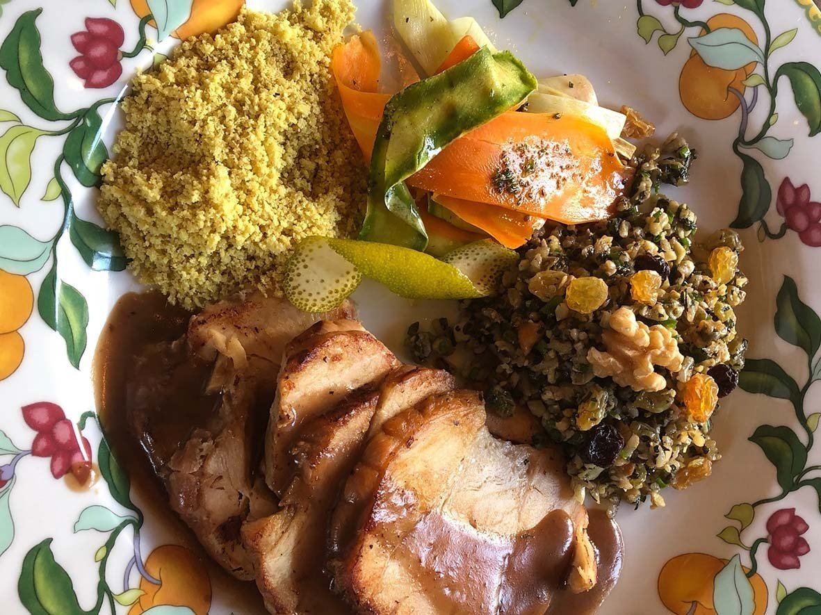 – Peru assado no próprio molho, salada de grãos com frutas secas e laranja, farofa e fitas de legumes.