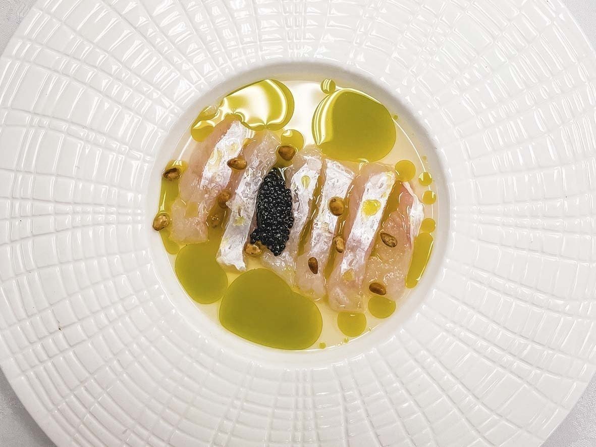 – Crudo de pesca do dia com água de tomate, pinhole, óleo de manjericão e caviar.