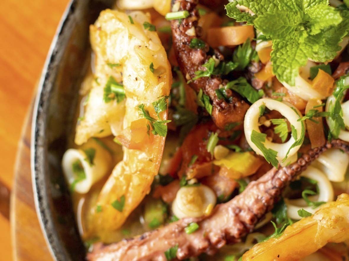 Por fim, há mais uma opção de prato principal, com a chegada do Frutos do Mar à Provençal, que tem polvo, camarão e lula frescos, acompanhados de torradas de pão rústico preparadas na padaria da casa.
