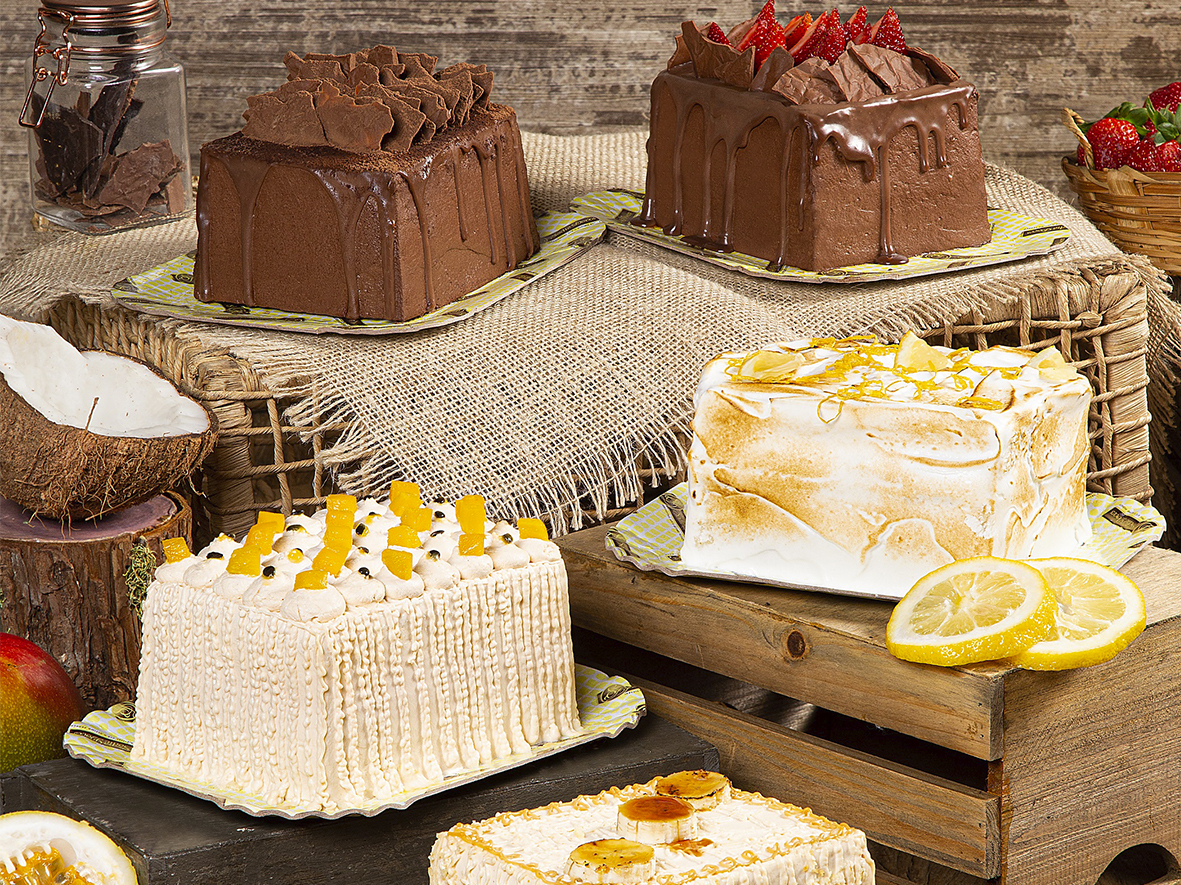 – Bolo Trufado: massa de chocolate, trufado aerado, cobertura de mousse de chocolate e decoração com plaquinhas de chocolate.