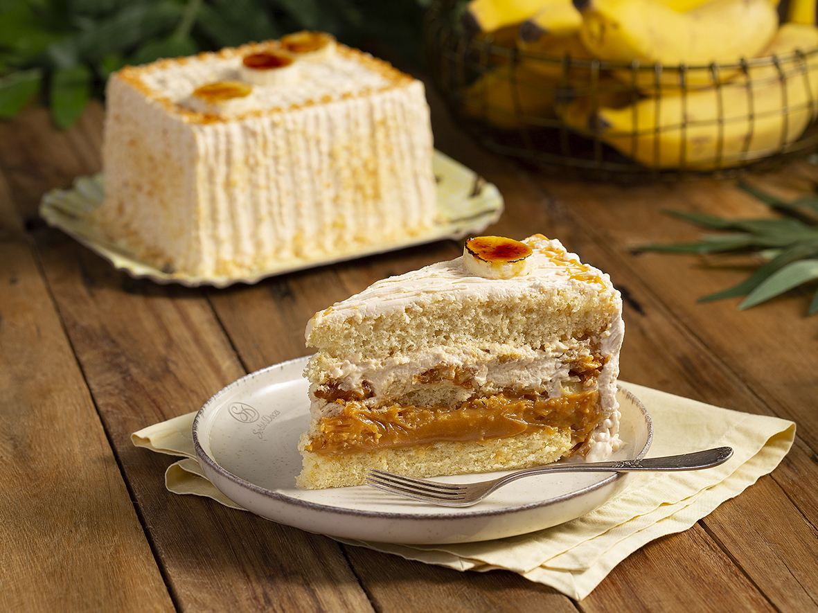 – Bolo Banoffe: com massa branca, recheio de doce de leite e mousse feita com a banana. Na cobertura, mousse branca, crumble de canela e bananas carameladas.