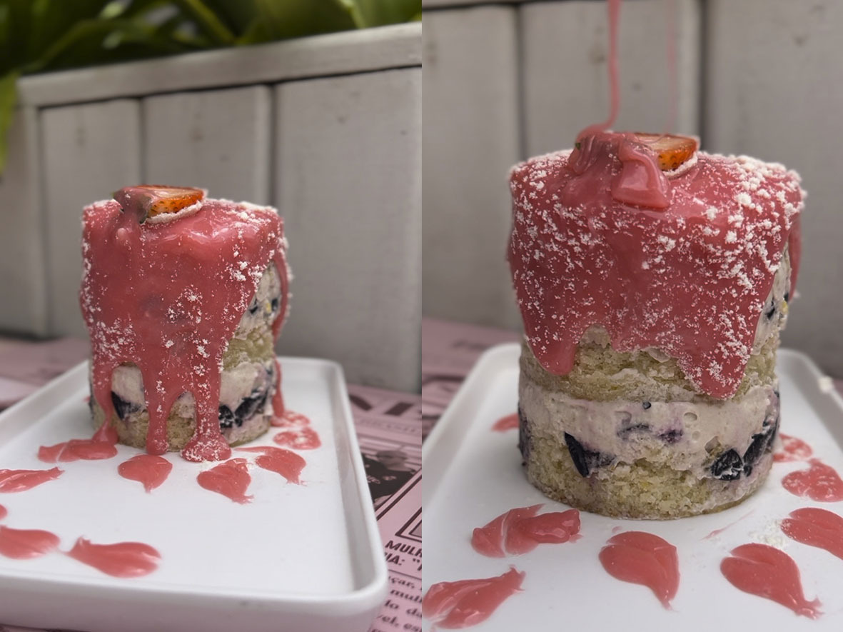 O Pink Cascading combina bolo pão de ló de baunilha, recheio de butter cream, raspas de limão siciliano e frutas vermelhas maceradas. A sobremesa é finalizada com uma cascata de ganache de chocolate branco, morangos e leite em pó.