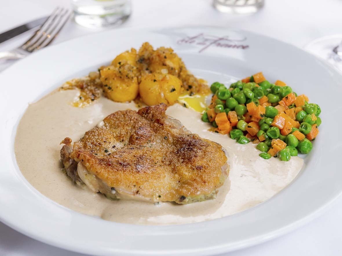 Os pratos de frango (polet) podem acompanhar pure de batatas e petit pois (ervilhas na manteiga servidas com cenoura em cubinhos). Os valores variam entre R$ 90,00 e R$ 115,00 cada prato.