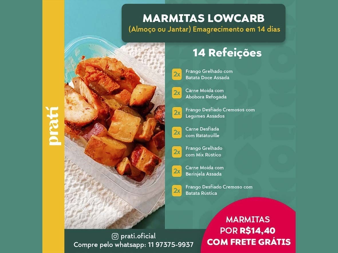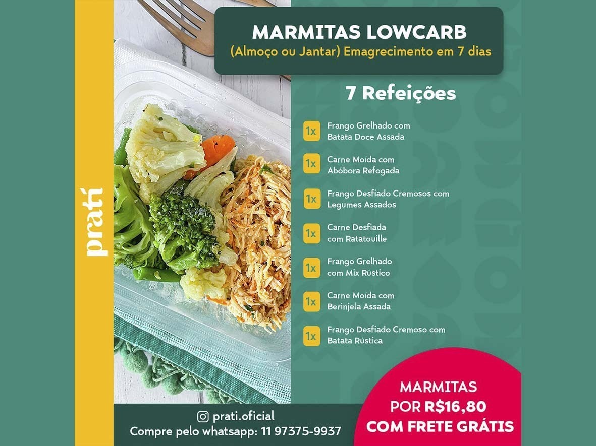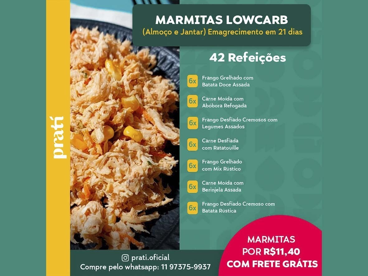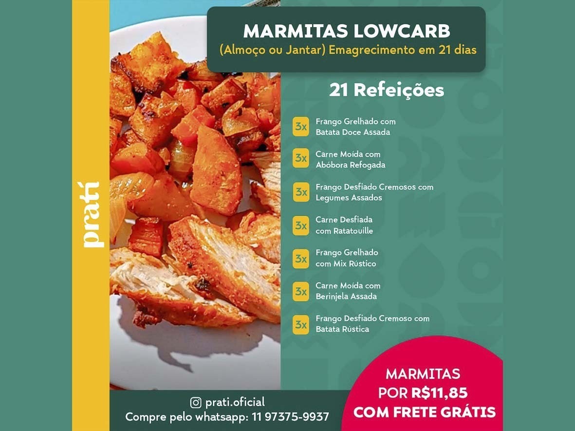 Outra opção é o Kit Lowcarb, com marmitas para 21 dias, em uma refeição diária, a R$ 248,90 por mês ou R$ 11,85 por dia. Este modelo traz os seguintes pratos: