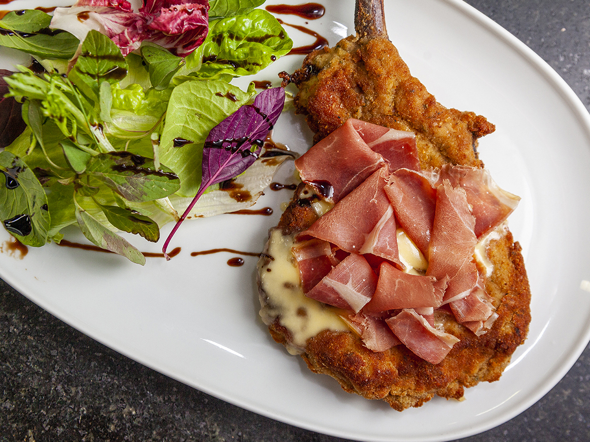 – Cotoletta alla parmegiana (R$ 105,00): prime rib suíno empanado com molho de parmesão e presunto cru.