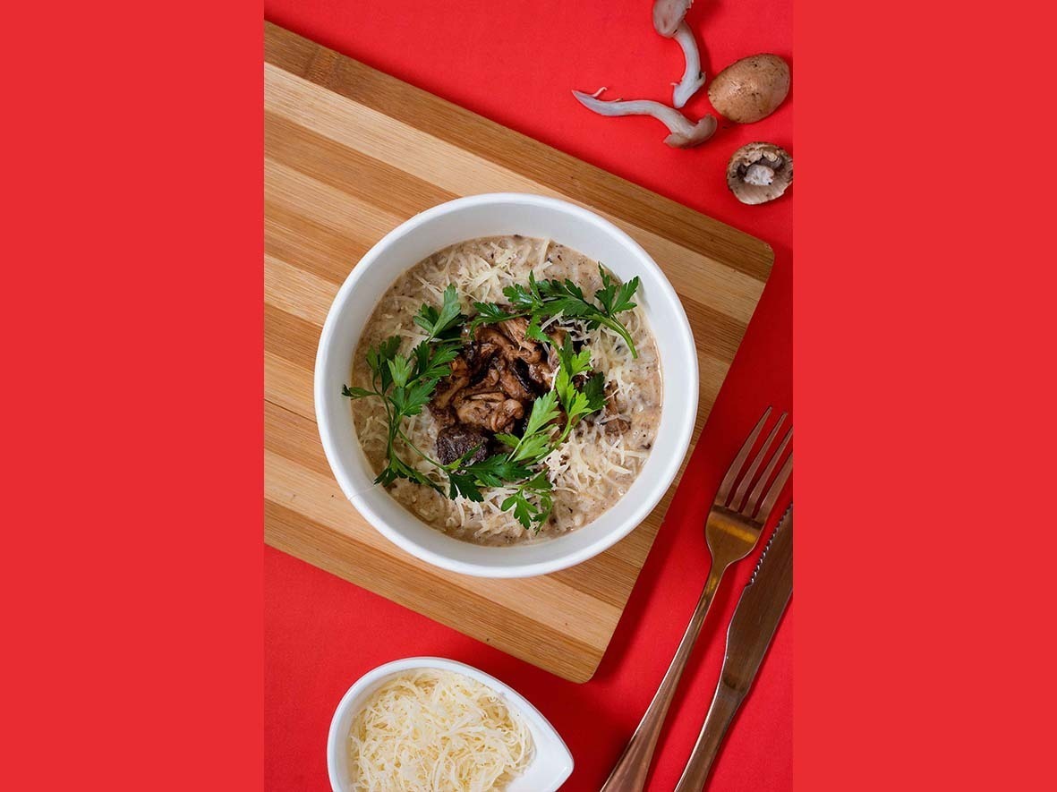 Uma das opções vegetarianas criadas pelo chef Gabriel Prestes é o Risoto Coguzen (R$ 38,90 – médio/ R$ 49,90 – grande), com arroz arbóreo, caldo de legumes caseiro, cogumelos salteados e queijo parmesão.