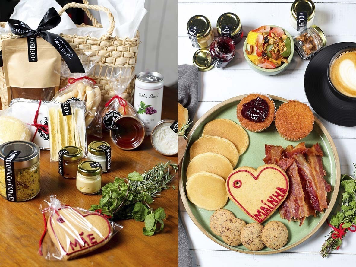 – Doce de Mãe (R$ 209,00): com mini torta cookie, fatia de red velvet, brownie, tradicional cookie, cinnamon roll, frosting de cream cheese, uma bandeja em madeira, mini vaso de flores ou mini bouquet de flores.