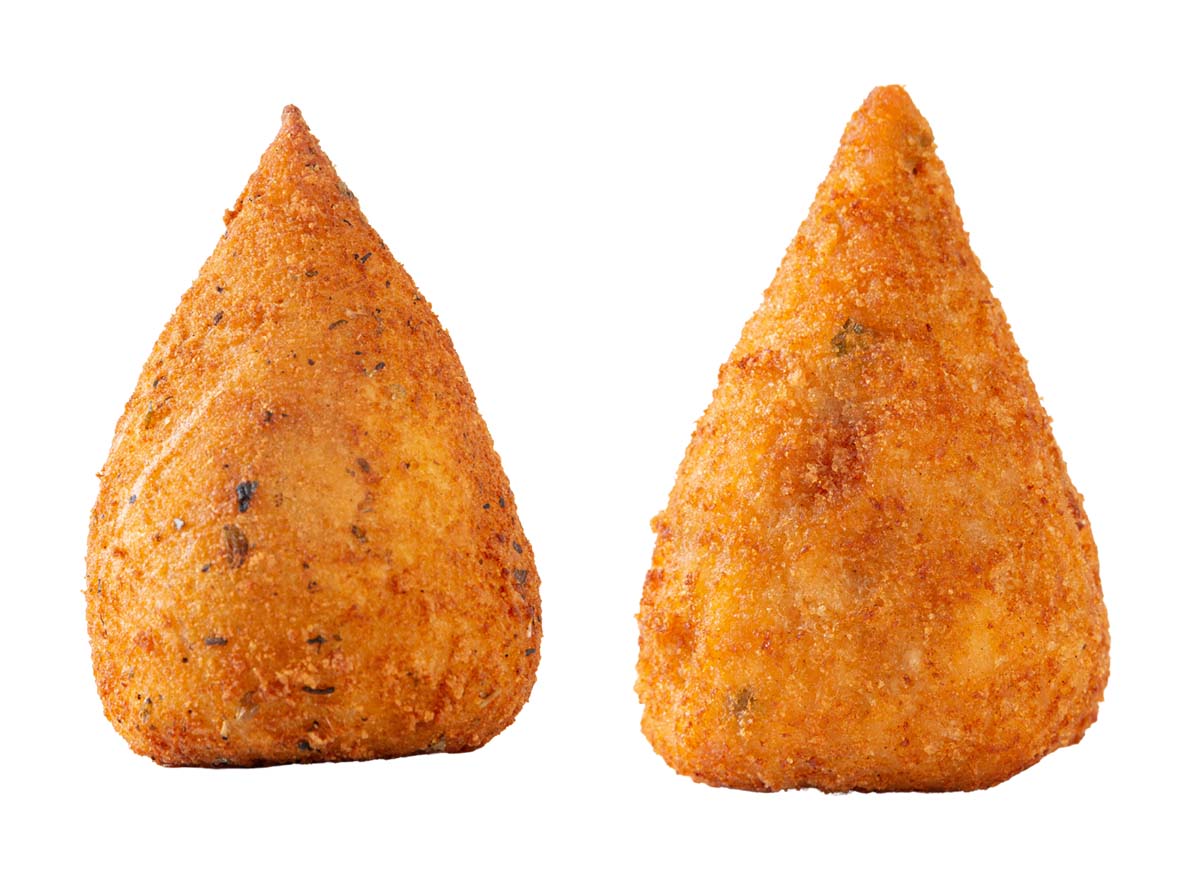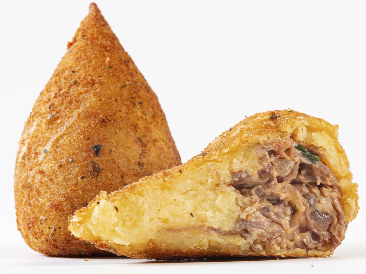 A coxinha de carne seca com massa de mandioca tem massa e recheio de carne seca com requeijão. Já a de frango com requeijão sem massa traz apenas uma casquinha crocante e fininha que envolve todo o recheio.