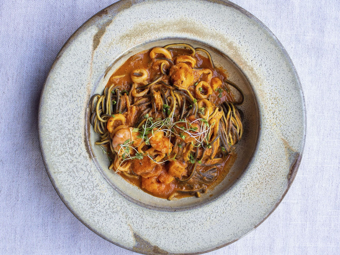 – Spaghetti fresco com frutos do mar (R$ 96,00): massa dupla de sêmola e tinta de lula preparada na casa, com molho pomodoro da casa com camarões, lula e polvo puxados na manteiga de camarões. Finalizado com manjericão.