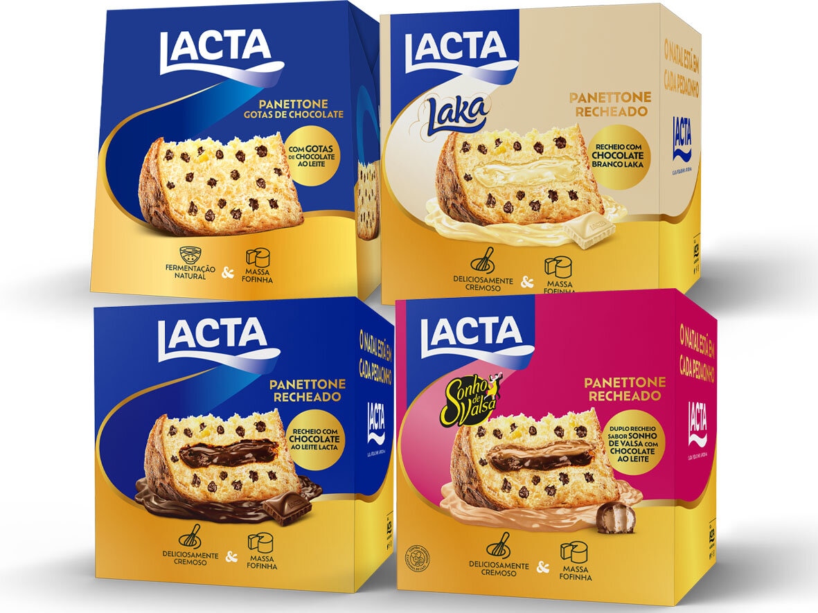 A Lacta, uma das marcas da Mondelēz, traz diversos produtos para as festas, começando pelas barras, que ganharam mensagens especiais para as comemorações. Também há os panetones da marca, nas opções Lacta Recheado Ao Leite, Sonho de Valsa, Laka e Gotas de Chocolate.