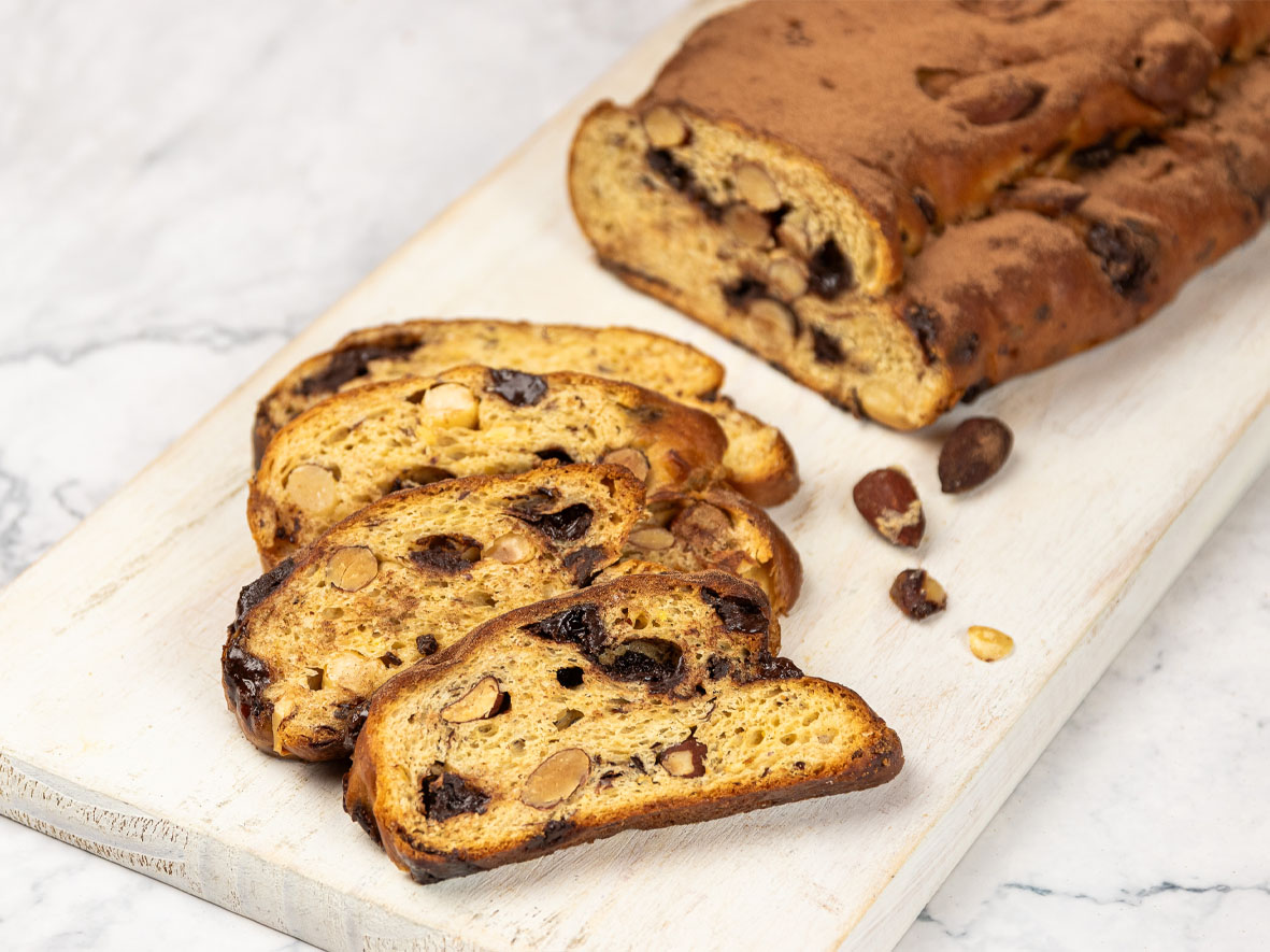 O doce alemão, que normalmente leva especiarias e frutas secas e cristalizadas, ganha aqui uma versão em parceria com a Callebaut, resultando em um pão com chocolate belga, notas amanteigadas e fermentação natural por mais de 36 horas.