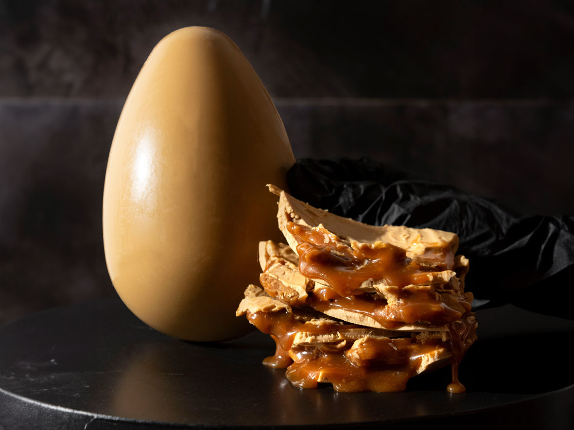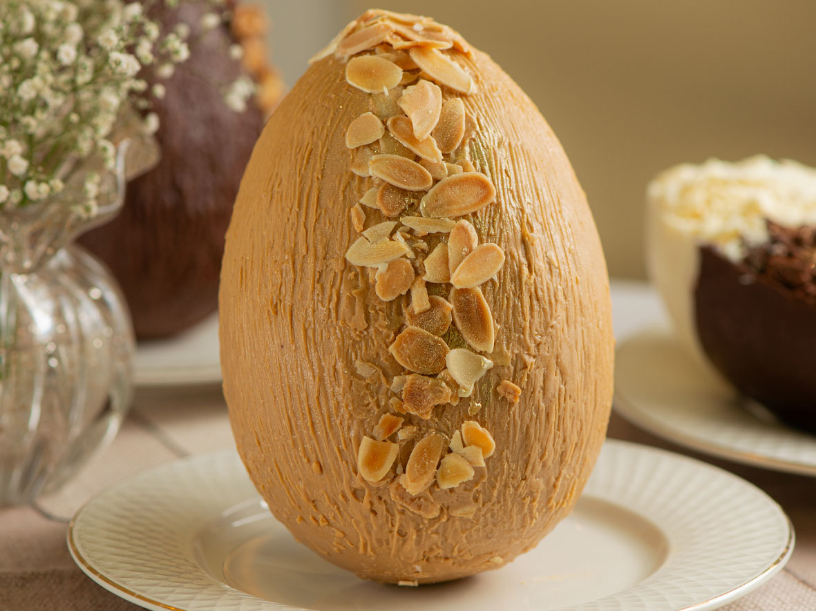 – Ovo Caramelo (R$ 245,00 – 400g): casca de chocolate branco caramelizado Gold Callebaut, recheio de caramelo artesanal salpicado com flor de sal e pedaços de biscoito sablée de baunilha.