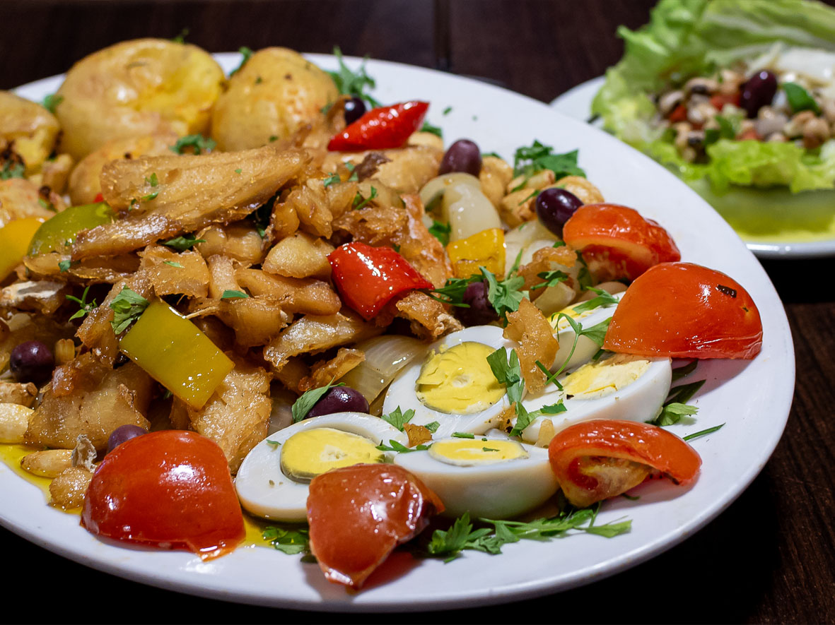 – Bacalhau de Braga: lascas de bacalhau em cama de cebola e dentes de alho, acompanhado de batatas coradas, ovos cozidos, tomate e pimentões. Acompanha: Arroz branco. Cortesia: salada de bacalhau com feijão fradinho, na concha de alface. R$ 199,00 – serve 2 pessoas.