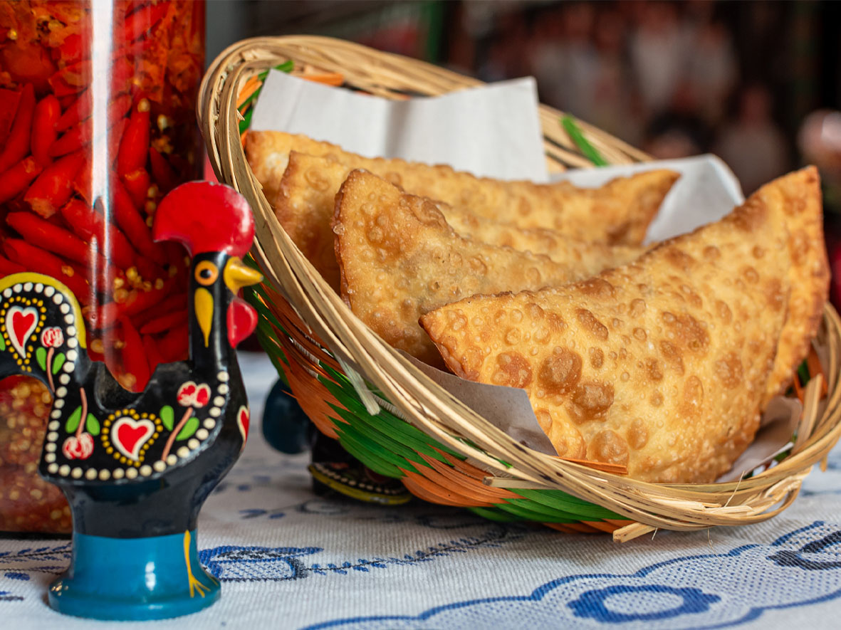 – Pastel de Camarão: massa de pastel recheada com creme e pedaços de camarão. R$ 10,00 (unidade).