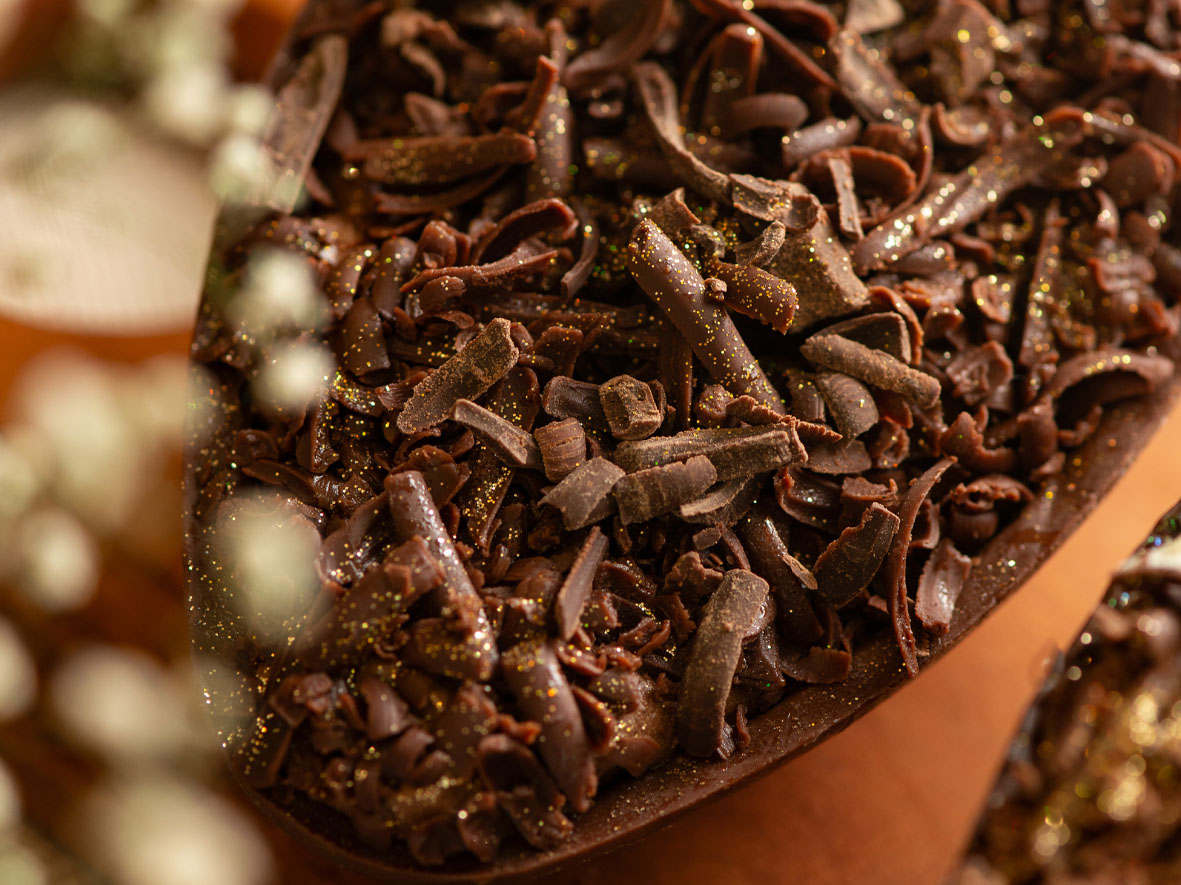 – Ovo Dark (R$ 80,00 – aproximadamente 400g): casca de chocolate blend, recheado com brigadeiro de café e finalizado com crumble de café.