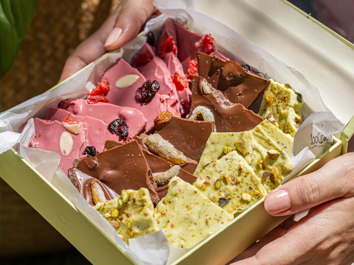 – Caixa lascas de chocolate frutadas (R$ 160,00): lascas de chocolate belga nos sabores belga ruby com frutas vermelhas desidratadas, chocolate meio amargo laranja e chocolate branco com pistache e pedaços de pistache.