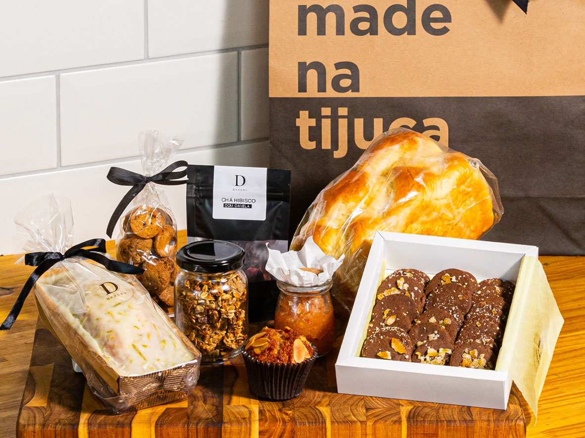 – Bag das Mães (R$ 165,00): cp, 1 brioche amanteigado DB (420g), 1 caixa de biscoitos sablé de chocolate com laranja (200g), 1 bolo chiffon de limão (350g), 1 granola vegana em pote de vidro (100g), 1 pacote de mini cookies (100g), 1 cup financier de amêndoas, 1 pacote de chá de hibisco com canela e 1 geleia maçã DB.