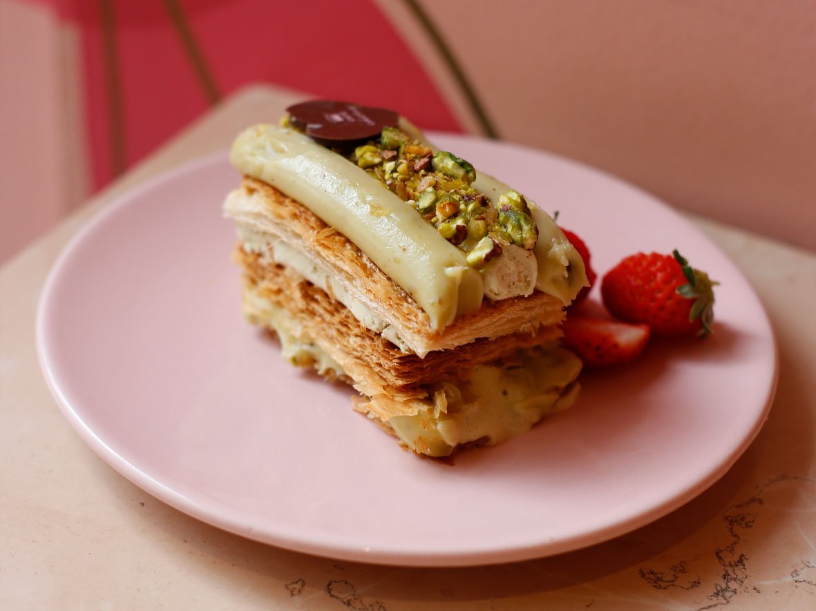 Enquanto isso, a sobremesa tem massa folhada, creme de pistache e pistache in natura em pedaços.