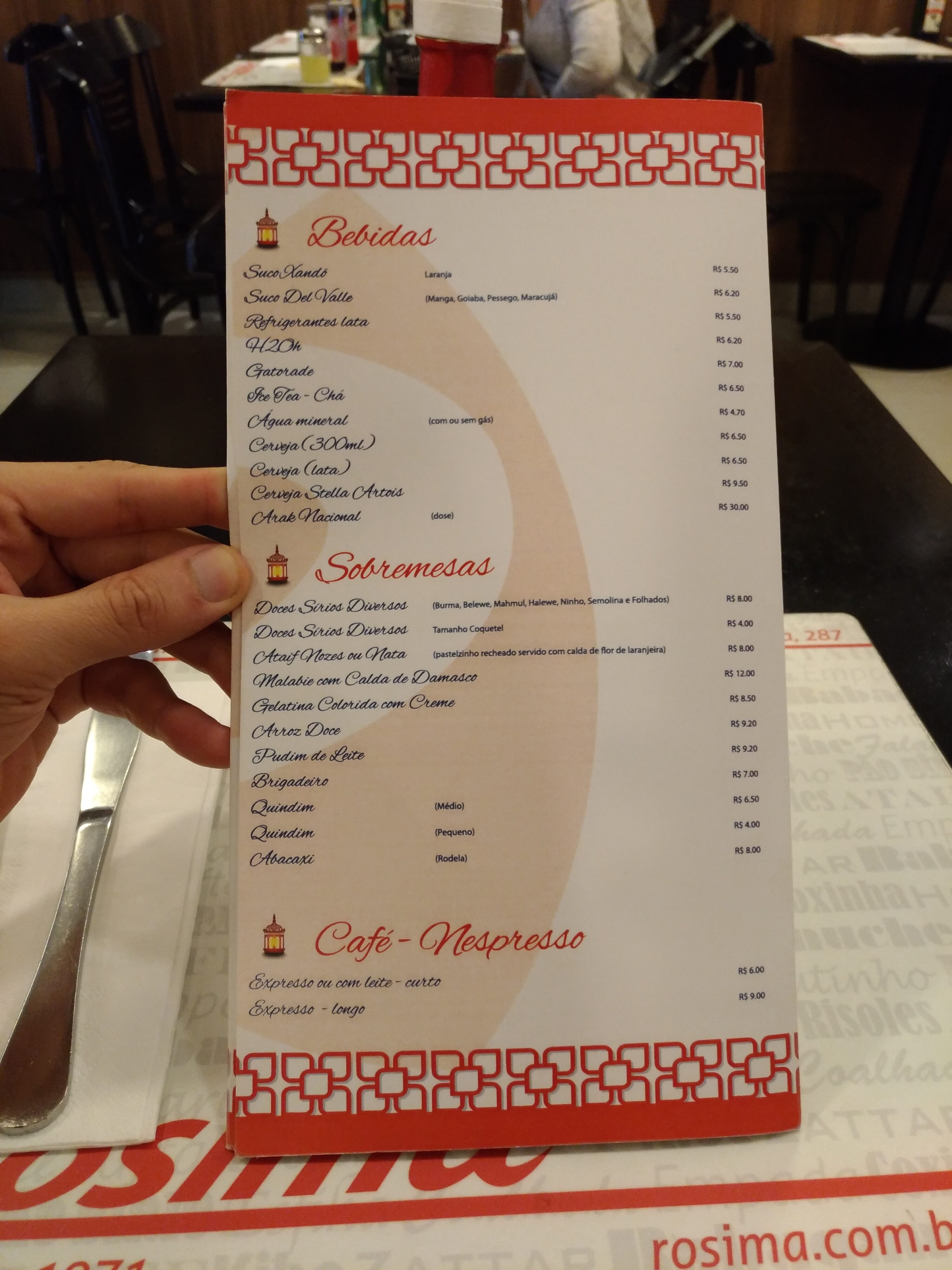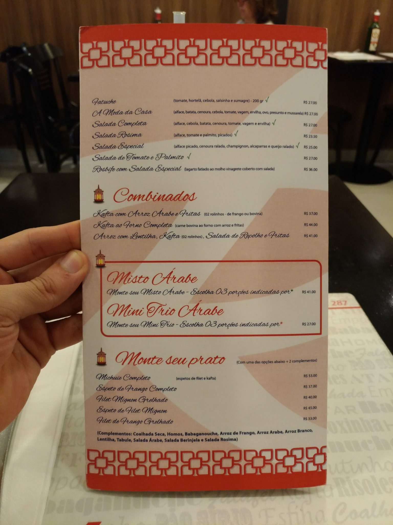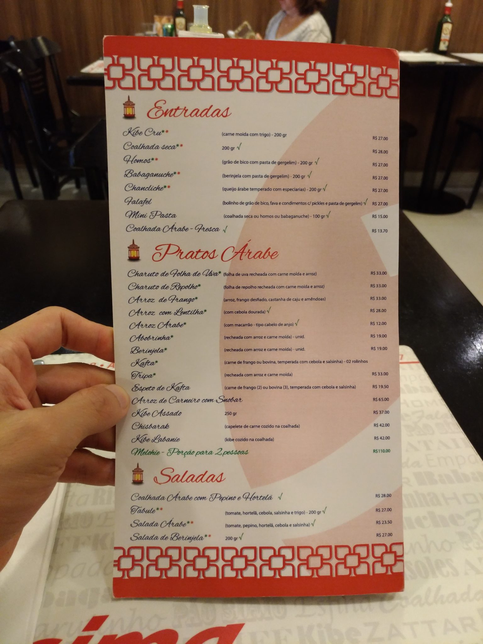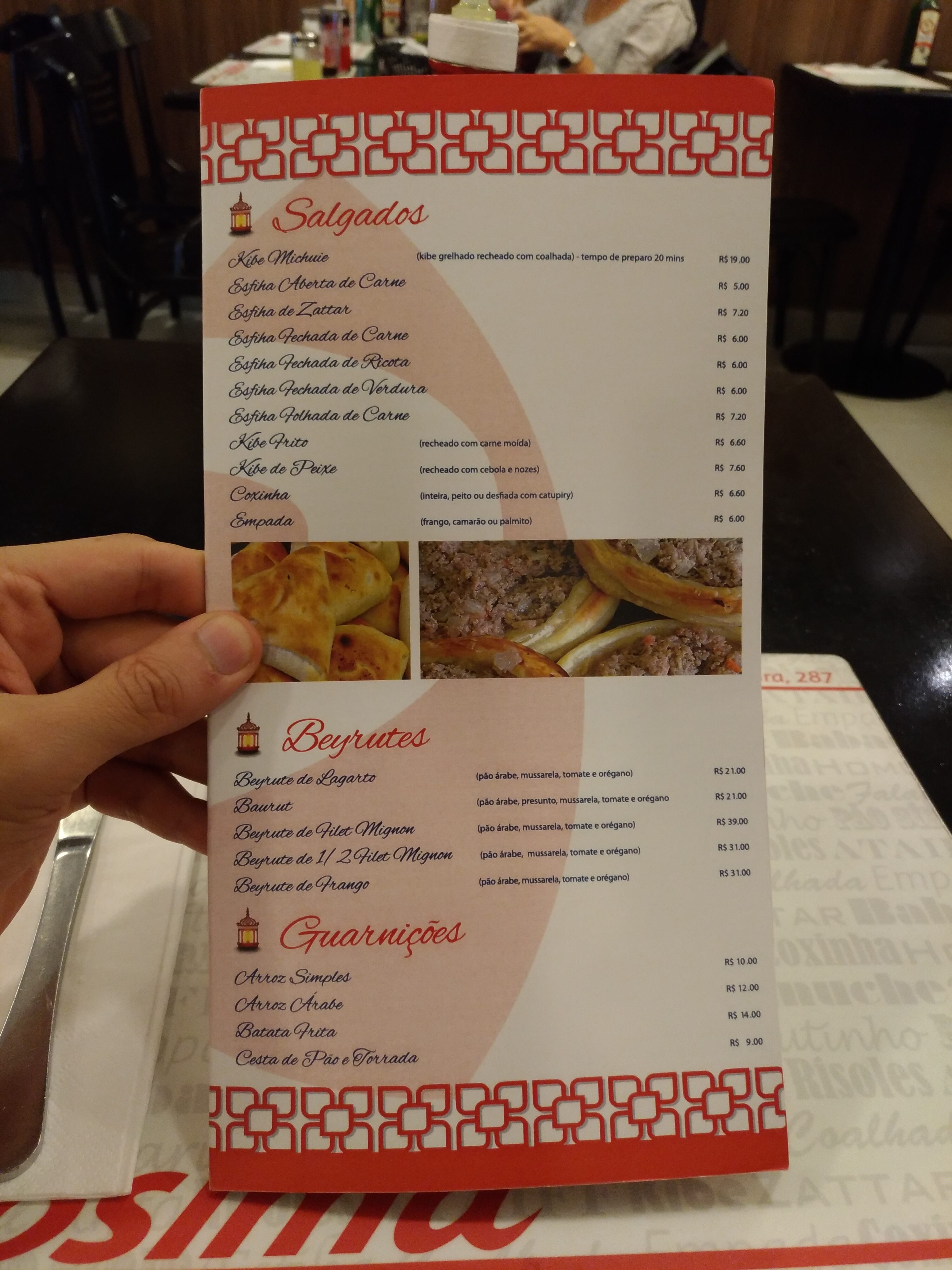 Como todo bom restaurante árabe, seu cardápio possui as opções tradicionais de pratos e sempre procurando manter o frescor dos mesmos.