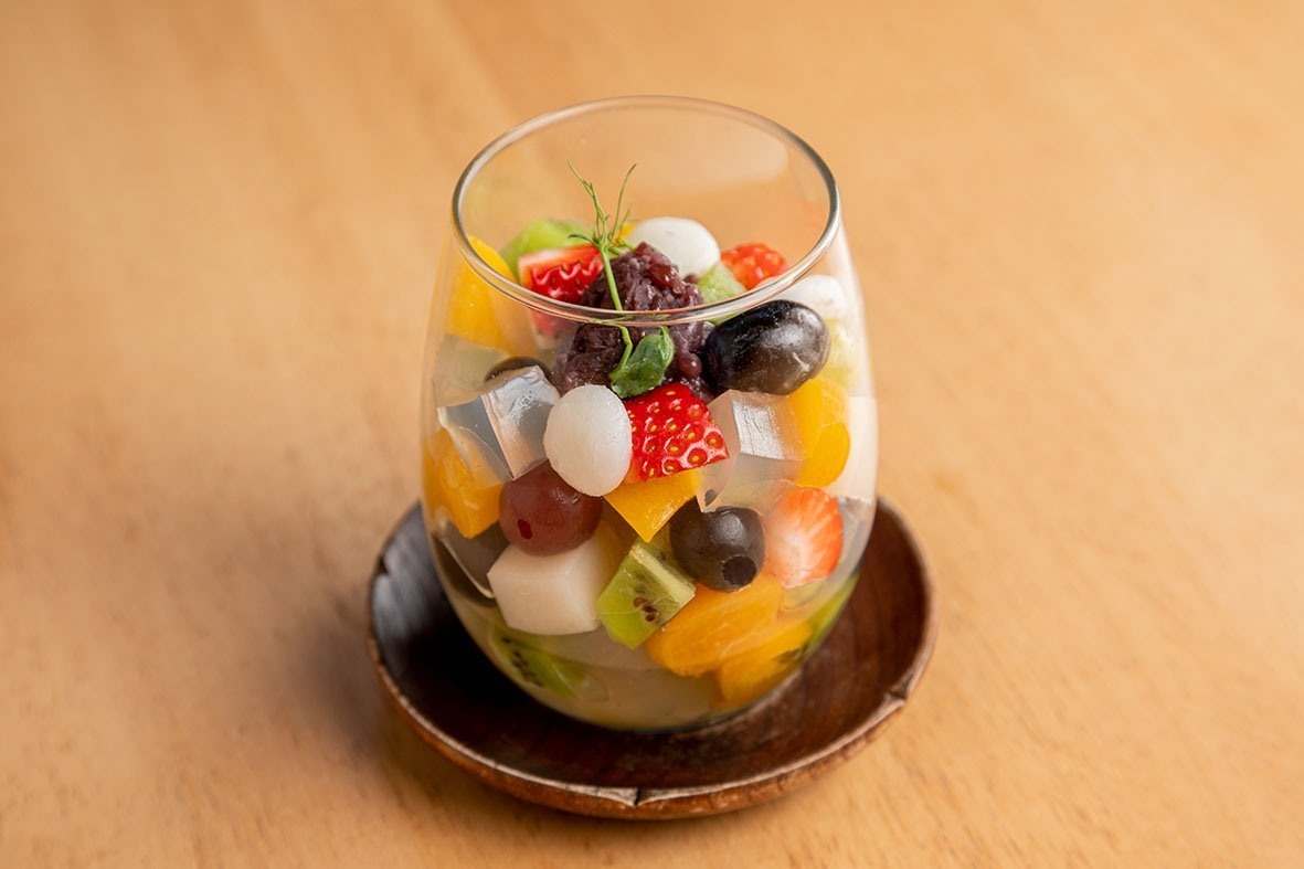 A sobremesa será a Anmitsu (com pêssego, uvas moscato e frutas da estação) com kanten (gelatina a base de algas marinhas), azuki (tipo de feijão japonês) e kibi dango (bolinho doce feito com açúcar, farinha de arroz e milhete), finalizada com calda de especiarias.