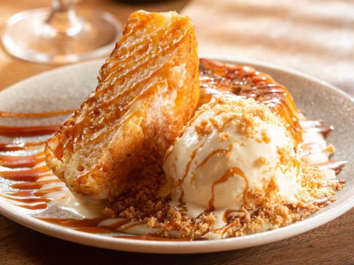 – Rabanada do O Fado servida com sorvete de iogurte, caramelo salgado e uma farofinha amendoada.
