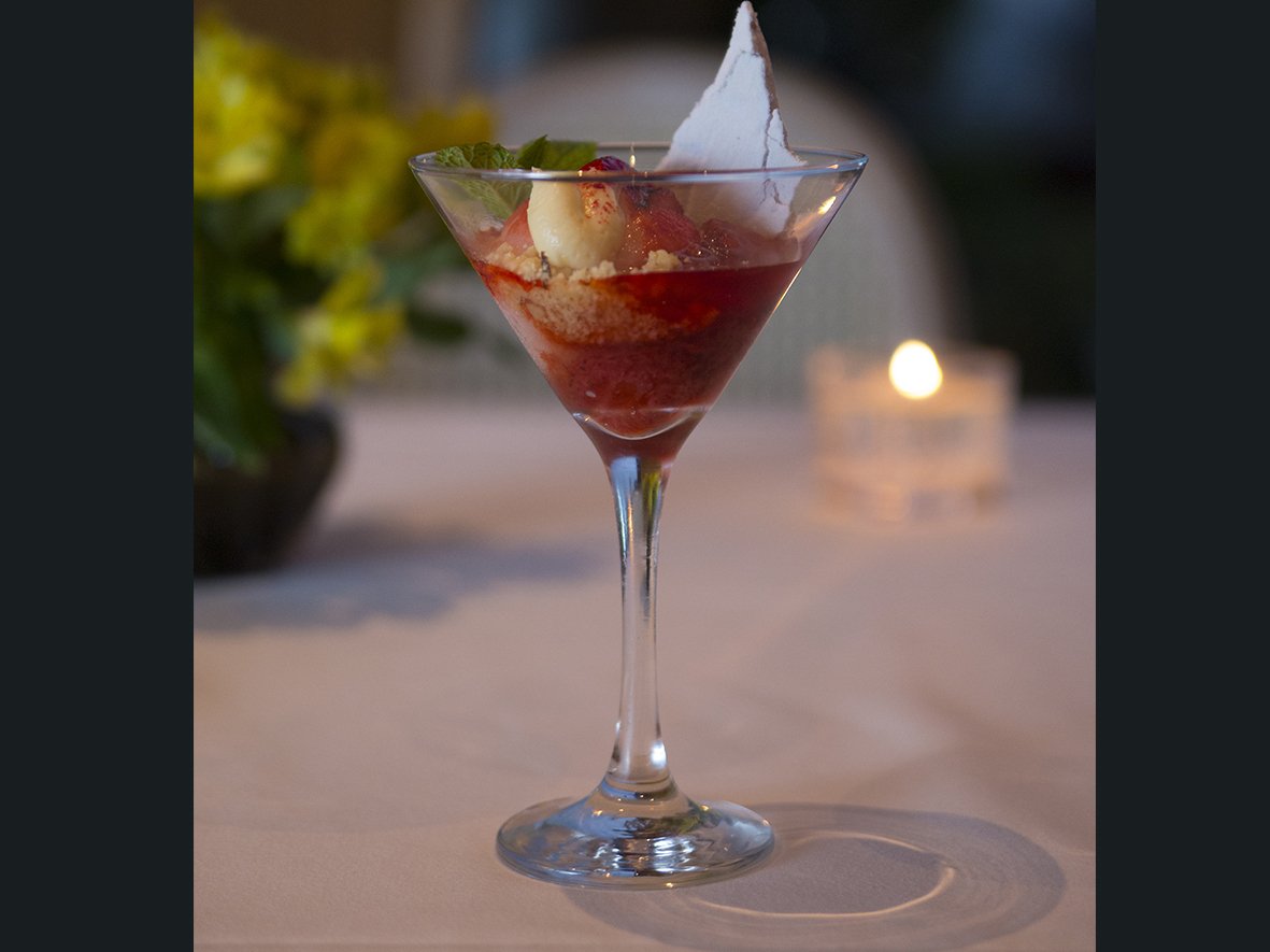 – Ou Fragole e Franciacorta: sorvete de morango ao vinho espumante, merengue e crumble de limão-siciliano.