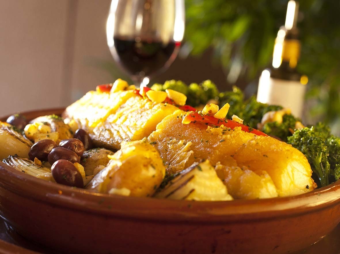 – Bacalhau ao murro com postas do lombo de Gadus Morhua assado no azeite, acompanhado de batatas ao murro, cebolas e brócolis, regado ao alho confitado.