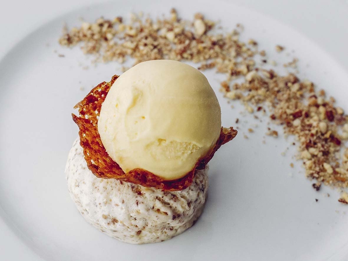 – Parfait de Amêndoas com sorbetto de pera.
