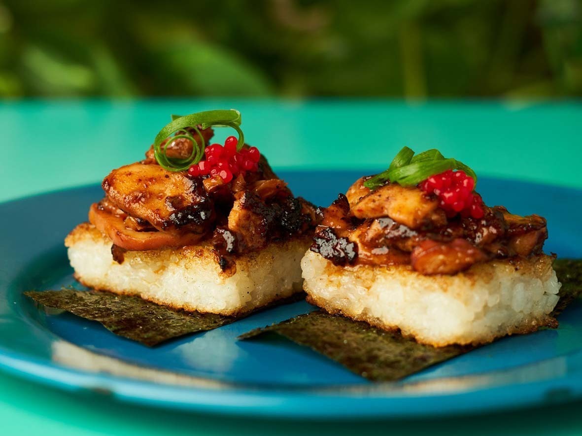 – Arroz negro de polvo com molho e espuma de moqueca.