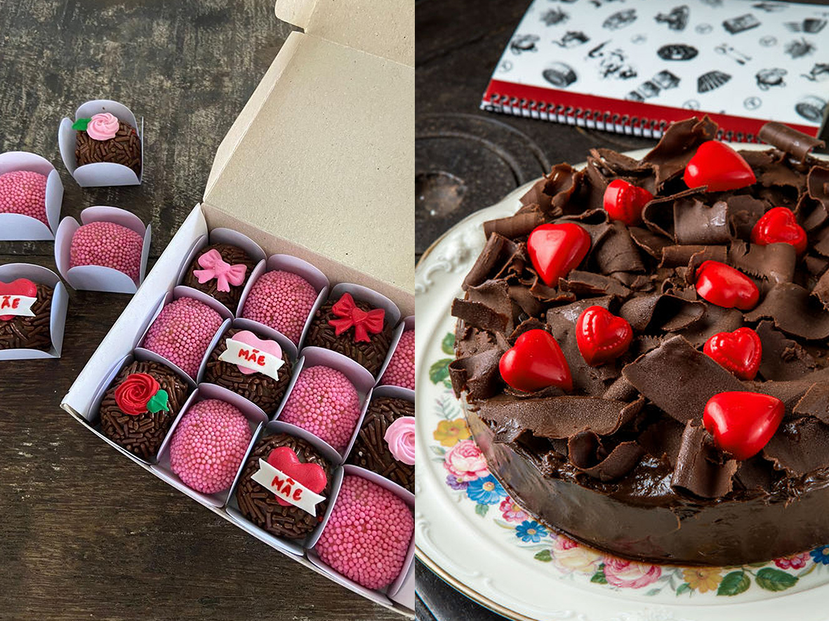 – Amor de Mãe (R$ 45,00) com 12 docinhos – 6 brigadeiros brancos com miçangas rosas e 6 brigadeiros tradicionais.