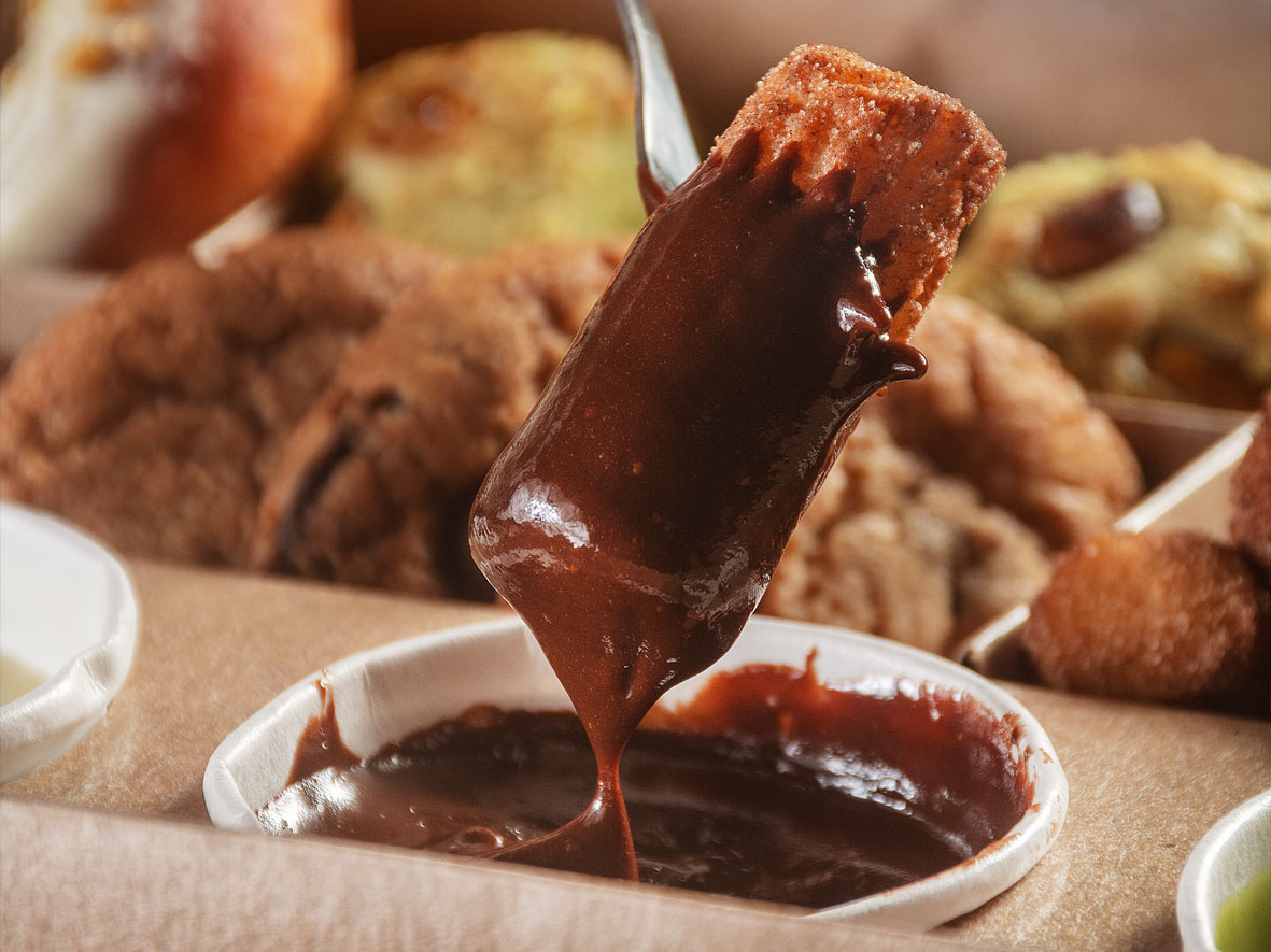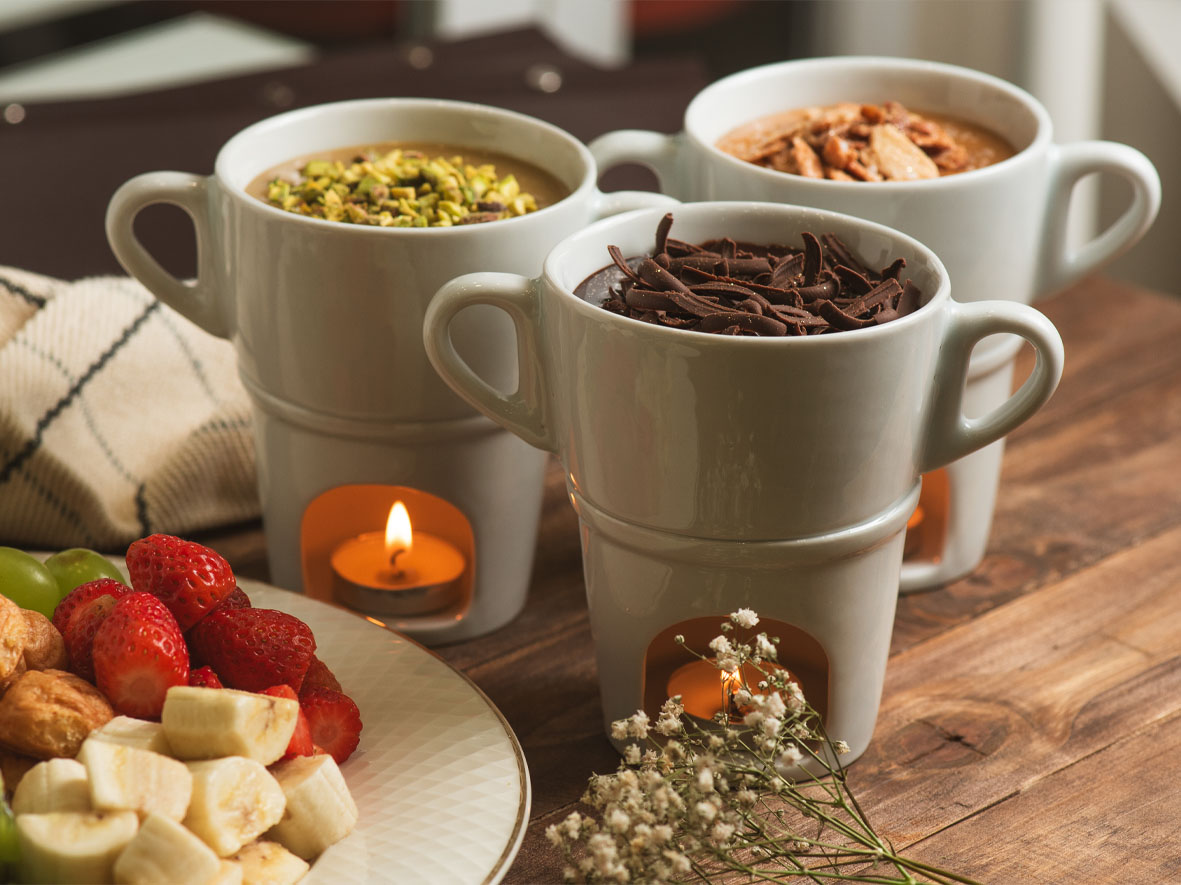– Fondue Doce (R$ 130,00 – serve duas pessoas) nas versões Fondue Pistache com pistaches picados; Fondue Caramelo Salgado com amêndoas e flor de sal; e Fondue Chocolate preto com raspas de chocolate. Acompanhamentos: banana, uva, morango, kiwi, degustação de éclair (massa) e marshmallow.
