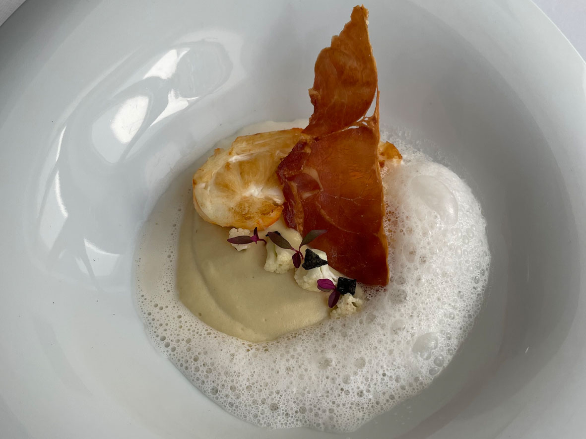 – Ou cavaquinha com variações de couve-flor e espuma defumada.