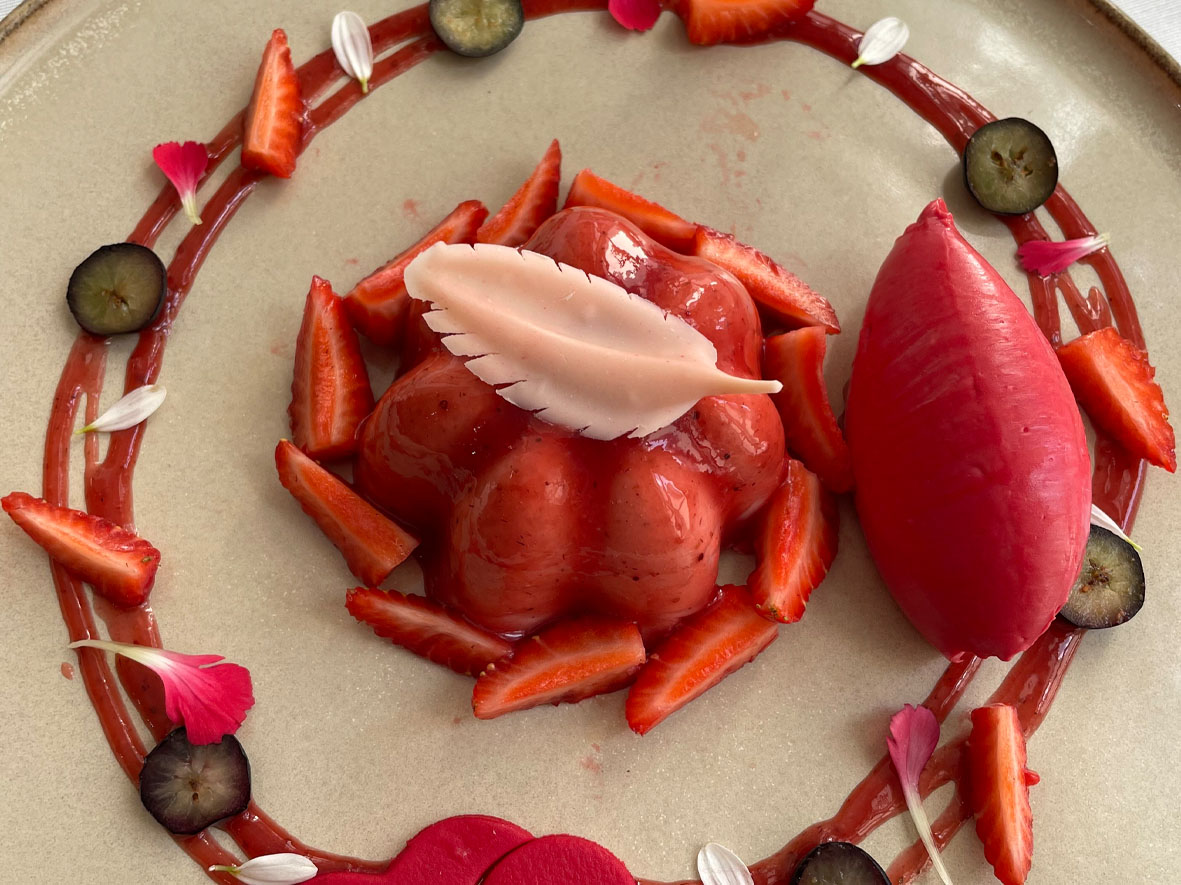 – Ou torta com ganache de baunilha, mousse e sorvete de morango com hibisco.