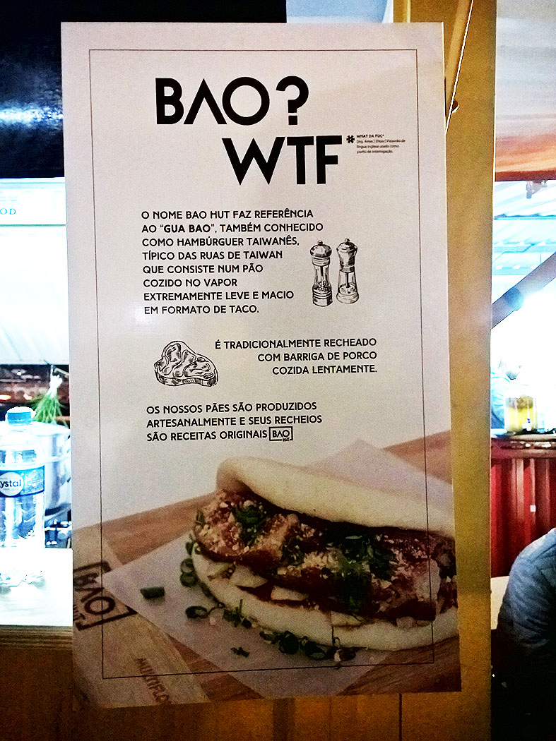 Para a galera que acompanha o Blog gostaria de dizer que na minha opinião a comida de rua aqui em São Paulo anda se desviando do que ela realmente deveria oferecer ao público. Não estou generalizando, ainda há comida boa a um preço justo! Mas não é a maioria dos casos e o fato do “Raio Gourmetizador”ter atingido esse meio torna o que deveria ser acessível em algo elitizado. Sou novo na rua mas trabalho com cozinha desde os 15 anos e sempre fui muito ligado a tradições e filosofias, então quando decidi migrar dos restaurantes para uma barraquinha a primeira coisa que pensei foi nisso. A Bao Hut quer fazer a sua parte como alguns ainda fazem em tentar manter/trazer de volta o conceito da comida de rua pois, achamos que tudo isso não é apenas uma “modinha passageira” e acreditamos que ela irá se tornar algo do cotidiano de todos, mas para isso acontecer depende de nós que empreendemos nesse negócio nos mantermos fiéis ao movimento.
