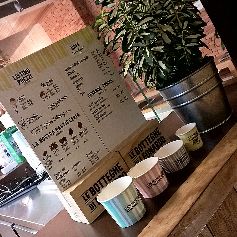 E esse nome, o que ele será que significa? “Botteghe” é o plural de “Bottega”, que significa : 1. Oficina Artesanal e artística, onde o mestre ensina as artes e trabalha ao lado de seus discípulos. 2. Loja de bairro, descontraída, acolhedora e familiar (informação retirada de um poster na loja) e “Leonardo” é uma homenagem ao Leonardo da Vinci, um gênio e ITALIANO(não, não era por fazer gelatos kkkkk… espero que conheça esse gênio, senão, recomendo procurar leituras sobre ele).