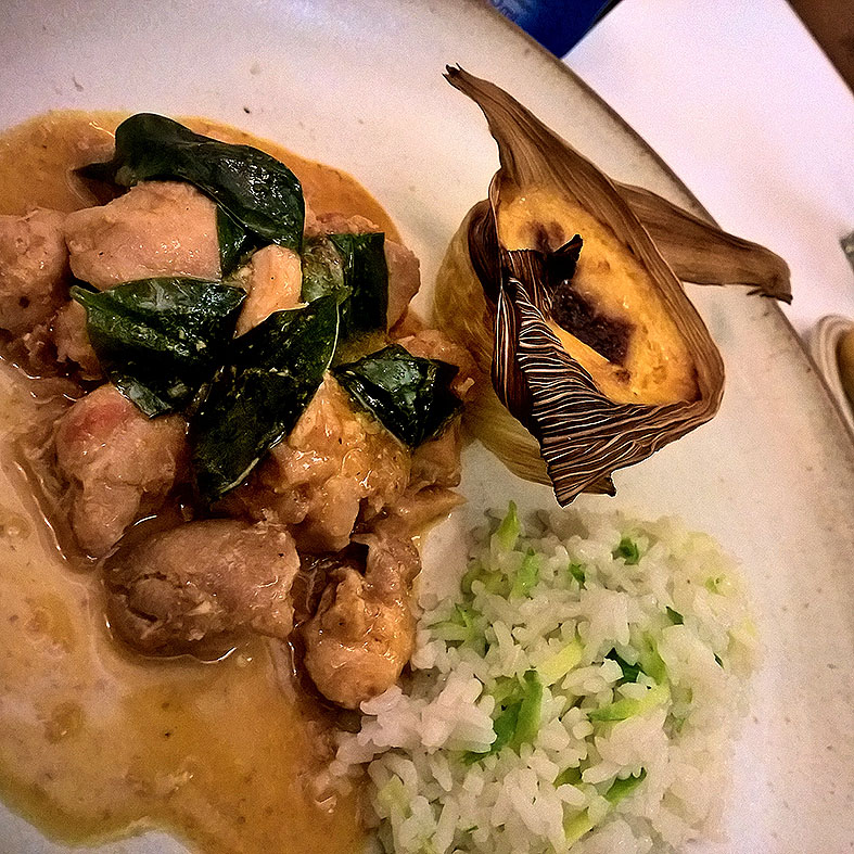 - Ragu de galinha com arroz de abobrinha, ora-pro-nóbis e curau na palha do milho.