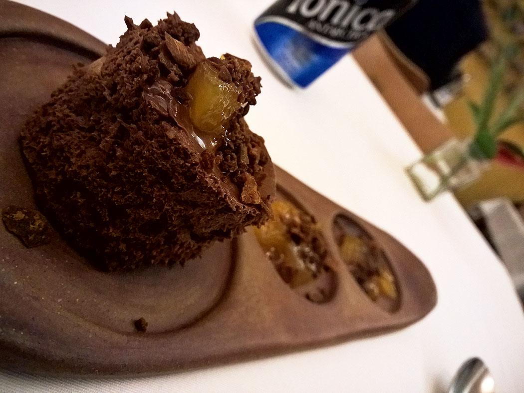 Pavê de chocolate, isso já diz muita coisa né? Chocolate em si, já é uma delícia e imagina um pavê combinando com uma compota de maracujá? Combinação que é difícil errar, a apresentação é um espetáculo a parte, gostei demais da forma e onde ela foi servida, a única coisa que não me agradou foi a farofa de buriti, não é uma textura que caiu bem para mim. O pavê estava delicioso, a textura macia e derretia na boca.