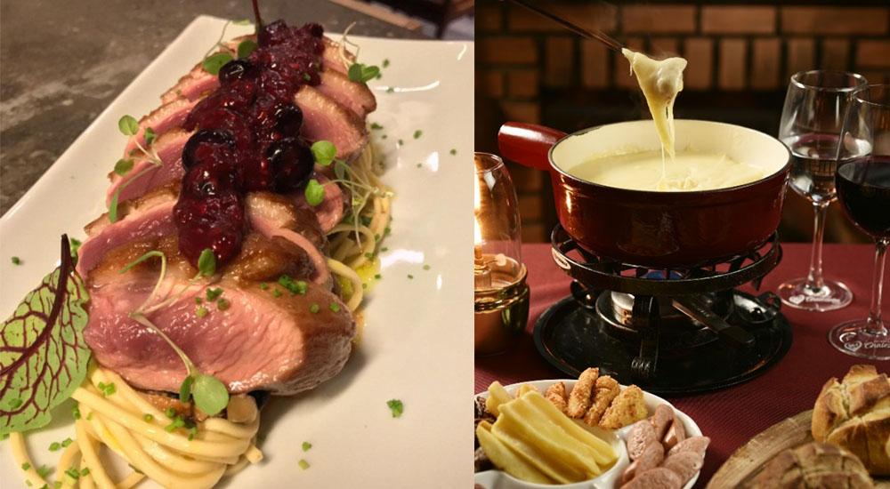 Cardápio com preço fechado. Couvert: embutidos, queijos, pastas e pães artesanais. Prato principal: fondue salgada ou dois pratos exclusivos. Sobremesa: fondue doce. Valor: R$ 422,00 (casal).