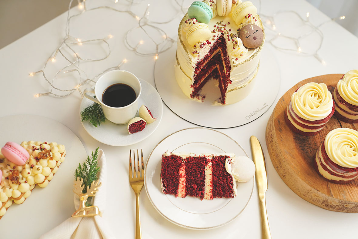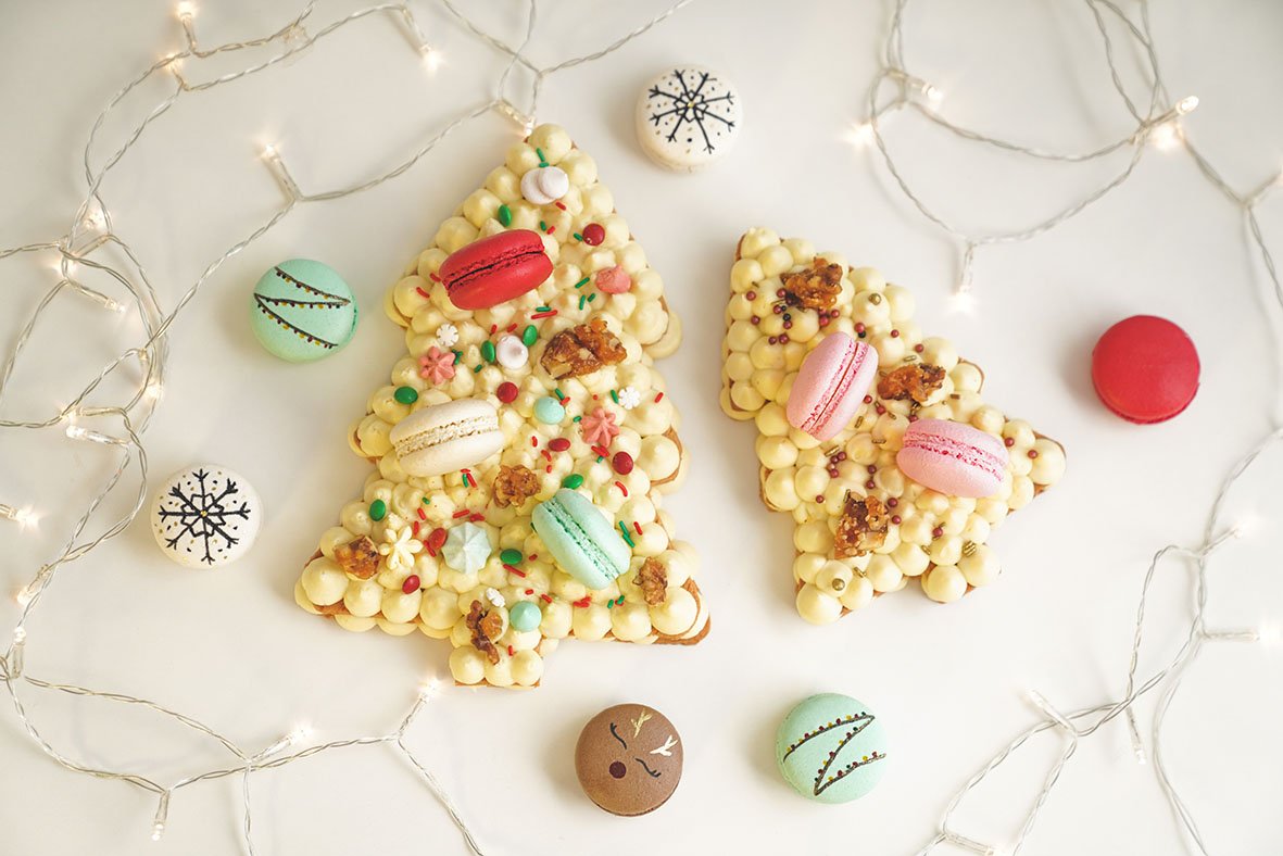 – Cake árvore de natal: massa de biscoito amanteigado sucrée de baunilha com recheio de creme de cream cheese com chocolate branco e geleia de morango;