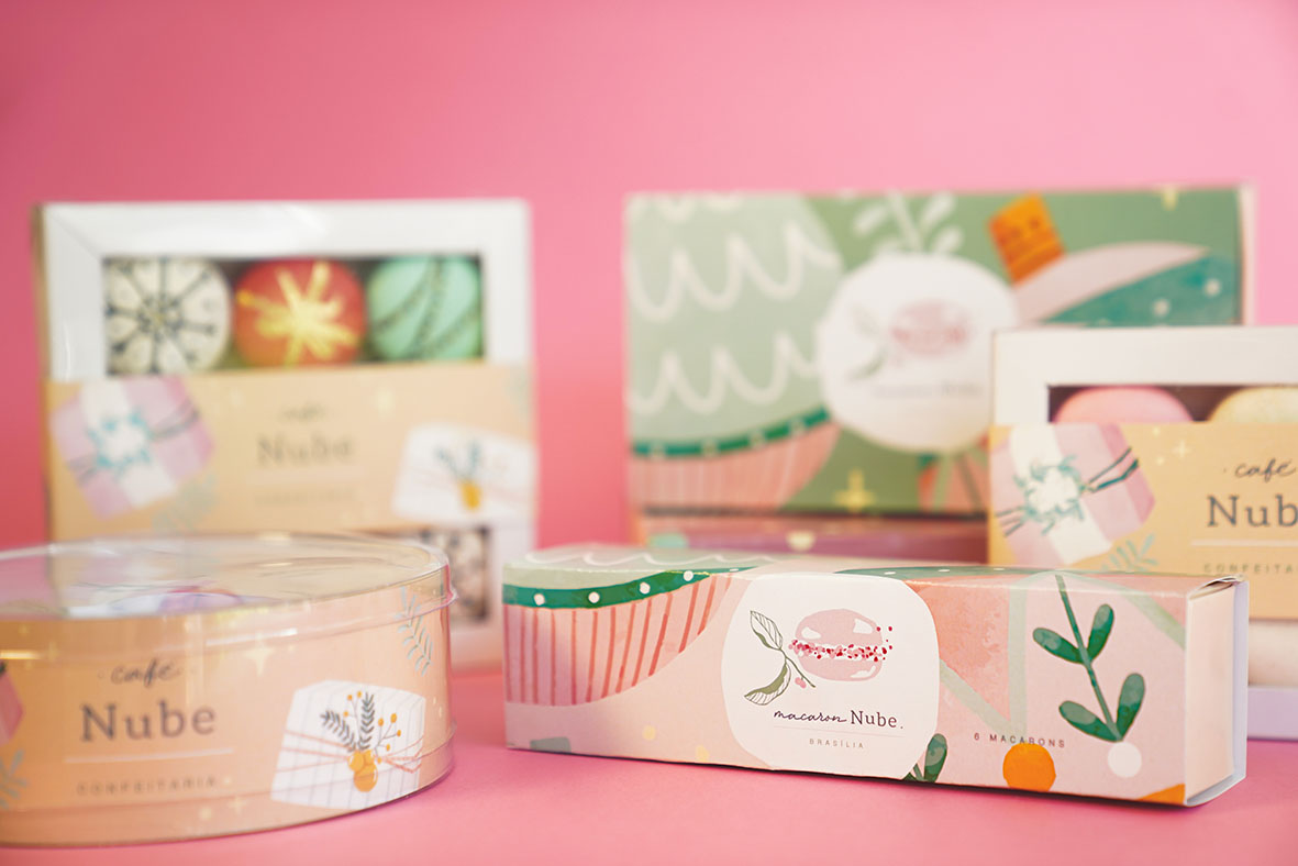 Os itens têm preço variado, começando de R$ 5,00 para cada macaron e chegando a R$ 240,00 para o bolo red velvet para servir até 25 pessoas.
