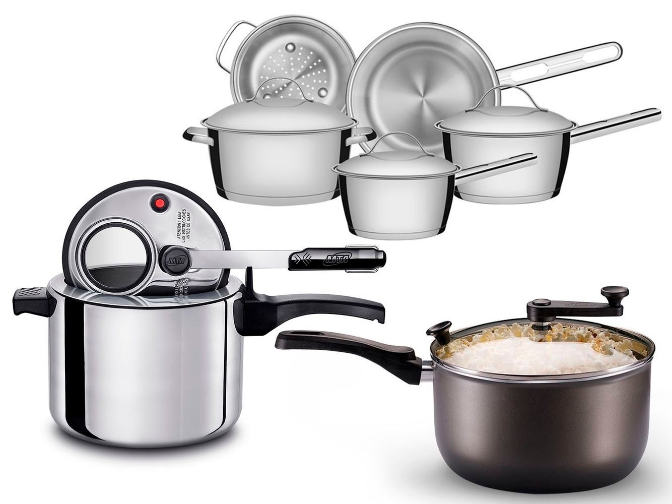 São 5 panelas de inox Tramontina, da linha Allegra. Elas têm fundo triplo, tampas com saída de vapor, são fáceis de limpar por não ter cantos, podem ir à máquina de lavar louças e ao forno, além de serem compatíveis com fogões à gás, elétrico, vitrocerâmico e indução.