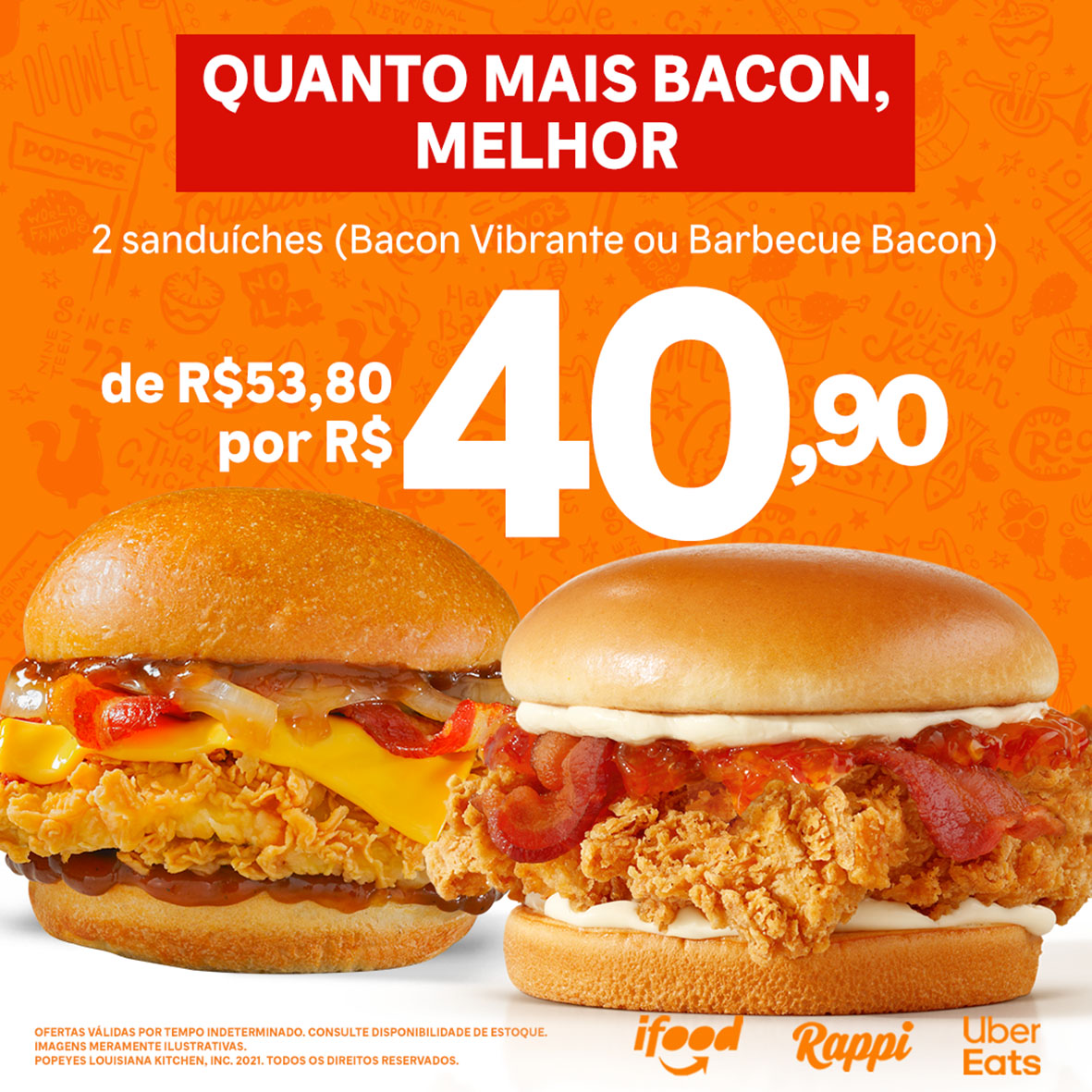 – Dois sanduíches (Bacon Vibrante ou Barbecue Bacon) por R$ 40,90;