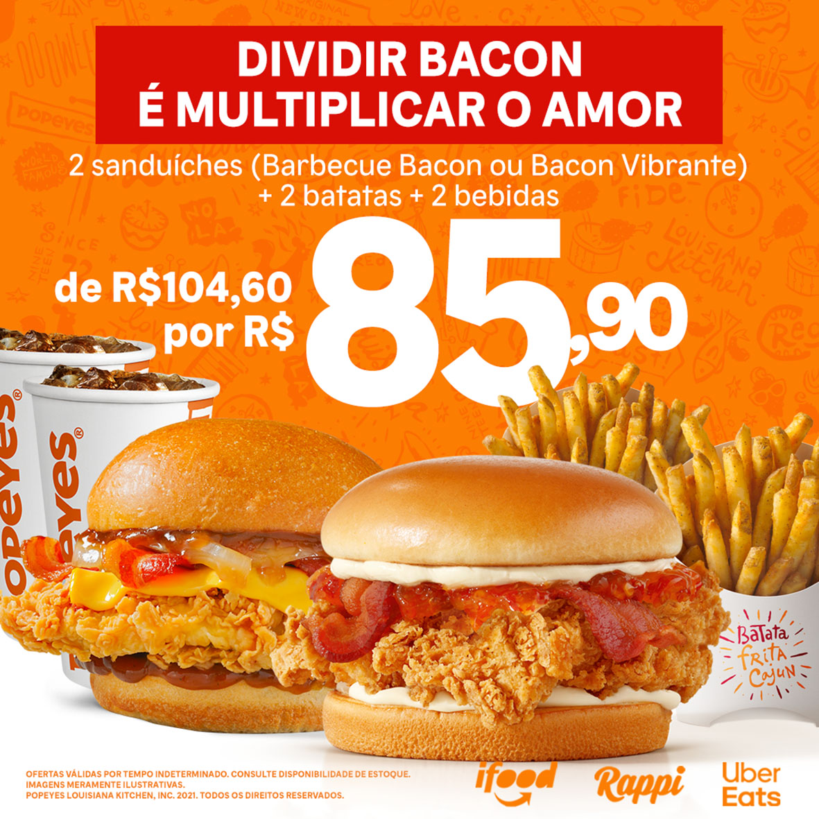– Dois sanduíches (Barbecue Bacon ou Bacon Vibrante) + duas bebidas (cerveja ou refrigerante) + duas Batatas Cajun por R$ 85,90.