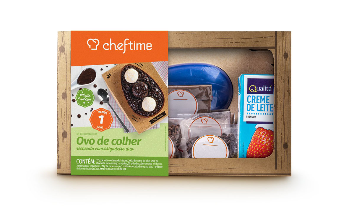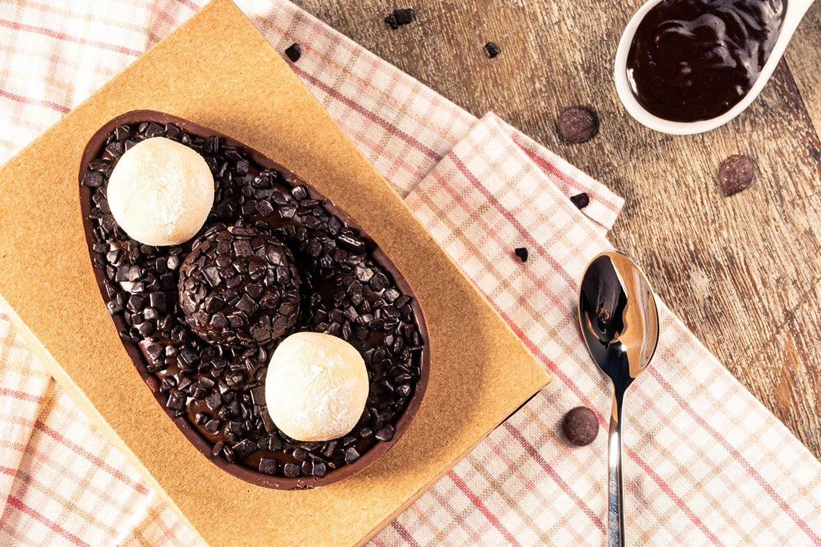 Para os adultos ou fãs de doces há o ovo de colher recheado com brigadeiro duo, tradicional e branco (R$ 58,99), feito de forma artesanal e com ingredientes selecionados.