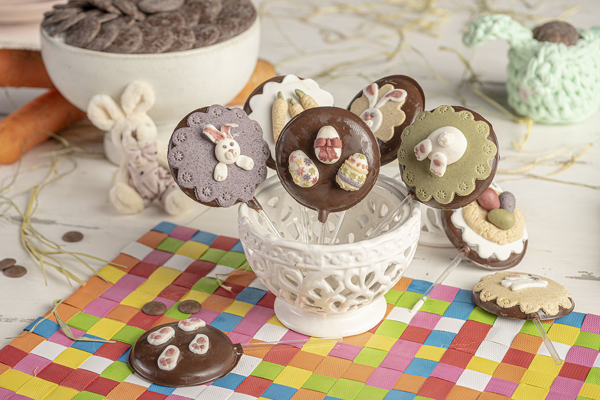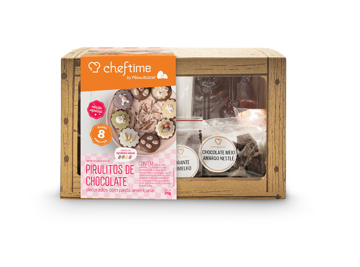 Um dos itens é o kit de pirulitos de chocolate decorados com pasta americana (R$ 39,99), para aproveitar o momento com as crianças. A pasta é tingida com ingredientes como cenoura, beterraba e espinafre em pó, além de usar farinha de uva.