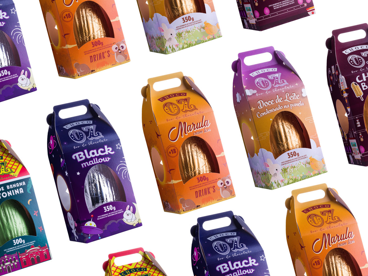 – Ovo de chocolate ao leite e branco com pedaços de bala de banana Antonina: ovo com uma metade feita com chocolate branco da Oz e pedaços das balas de banana e a outra com o chocolate ao leite da marca. 300g, por R$ 53,90.