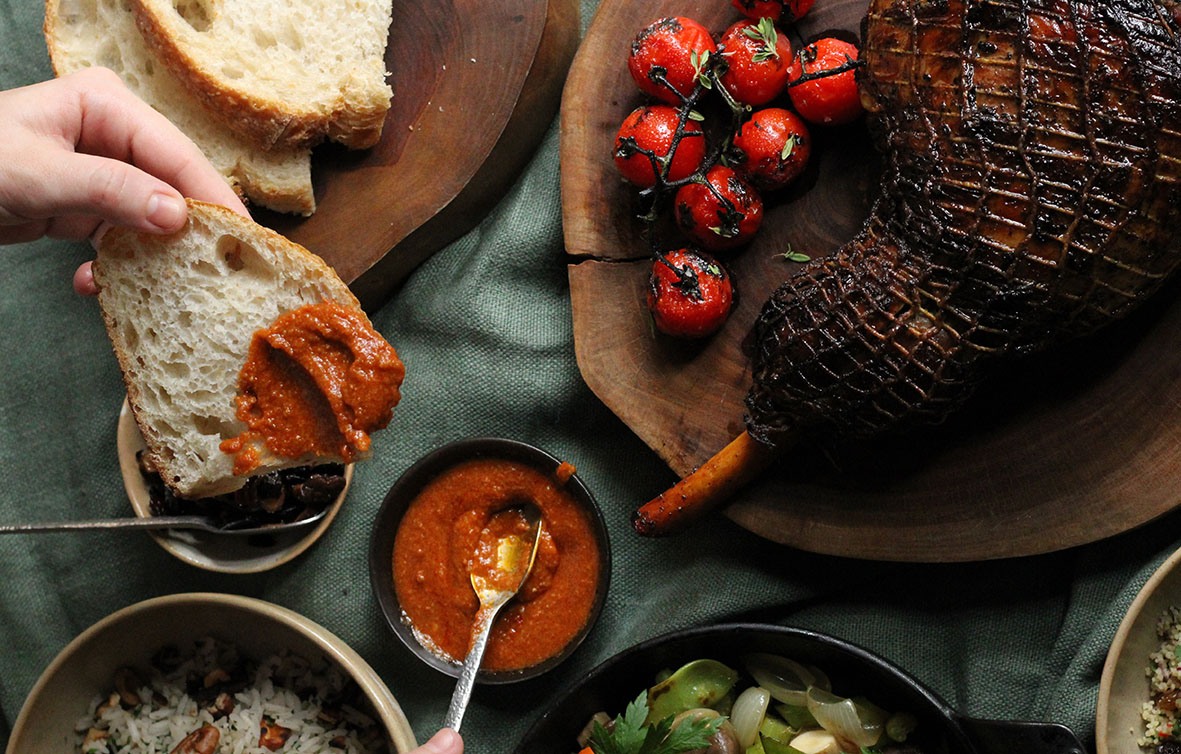 – Principal: pernil de cordeiro assado, com batatas e cebola, berinjela assada, coalhada, arroz de amêndoas e salada;